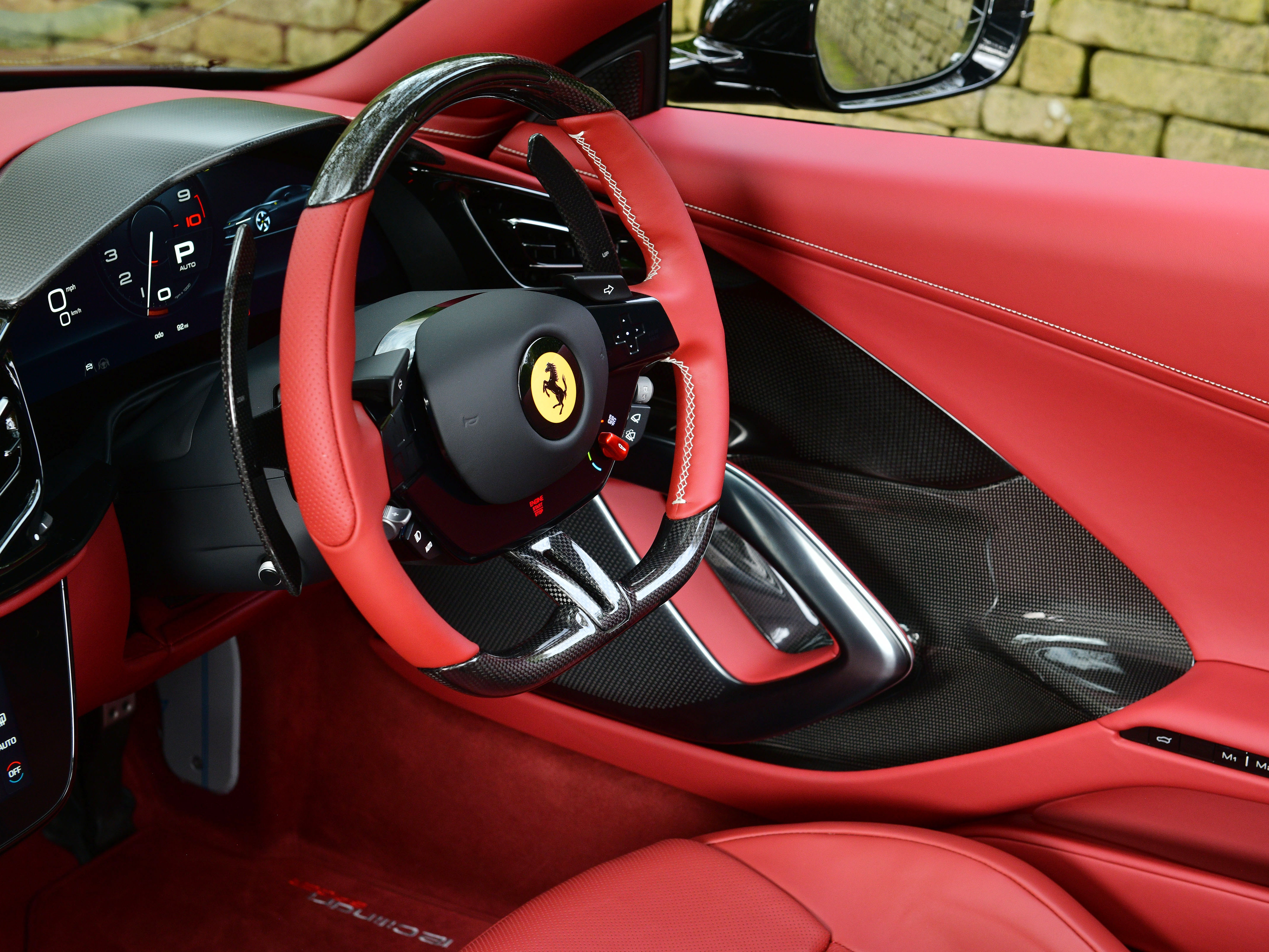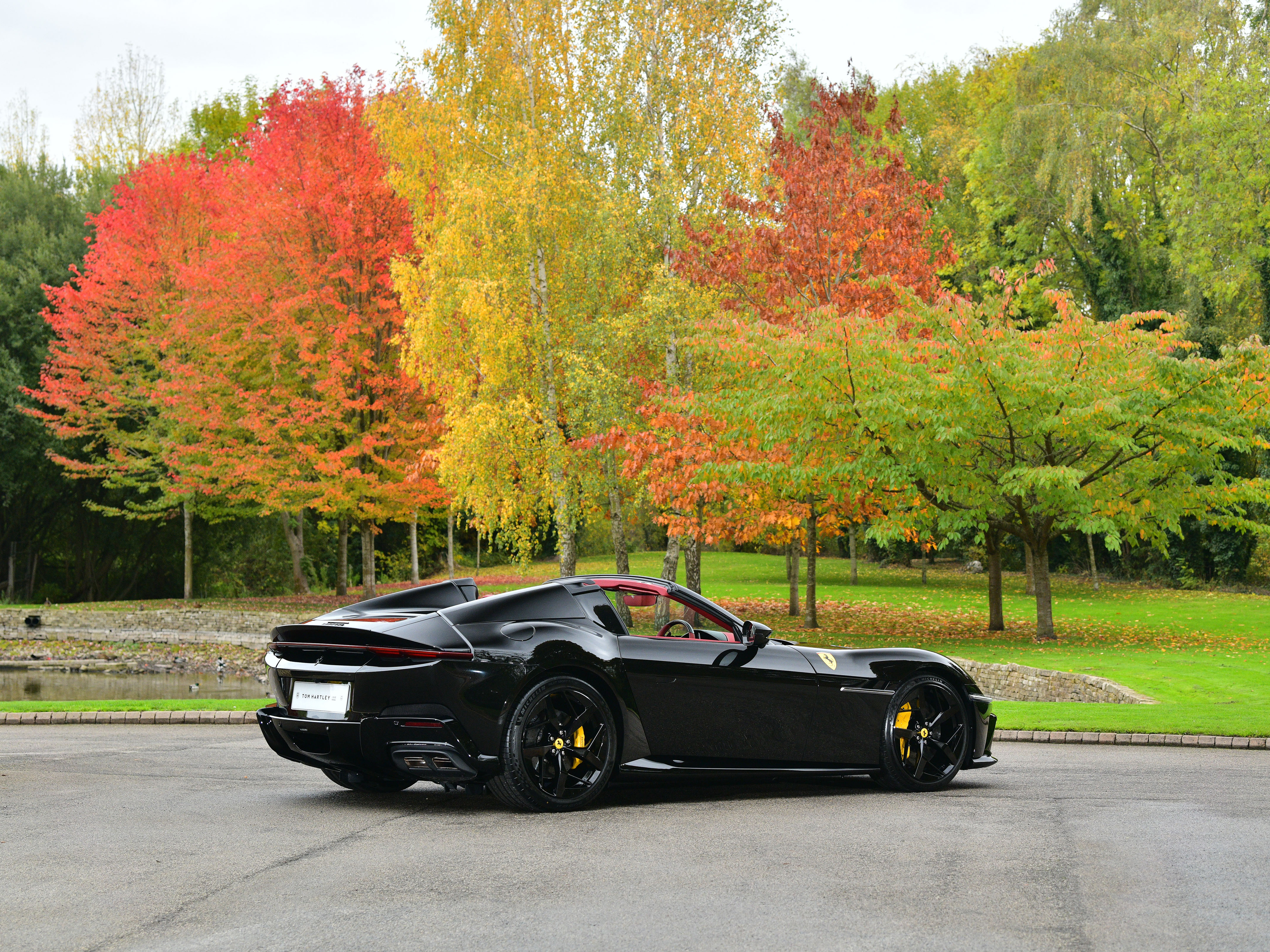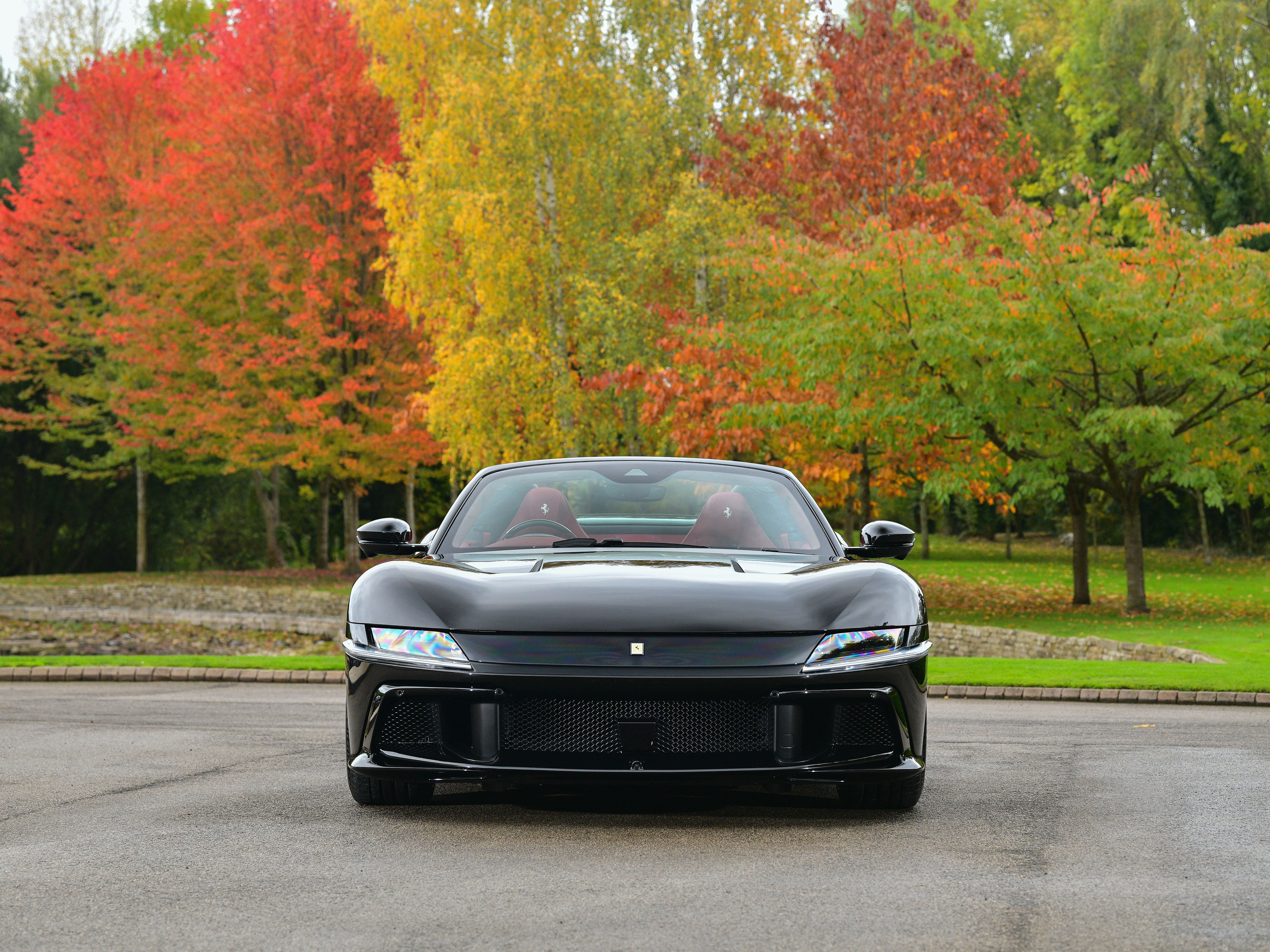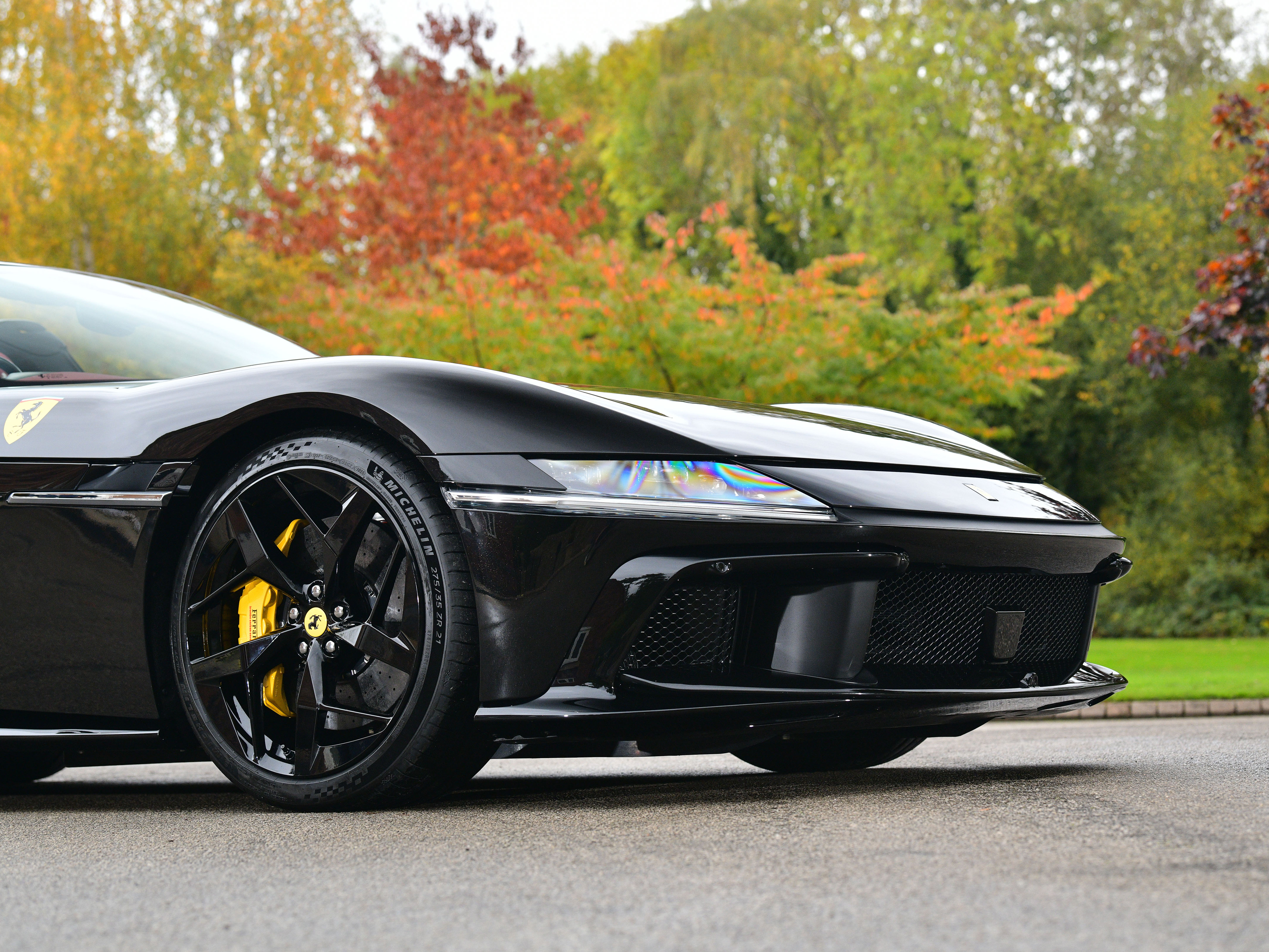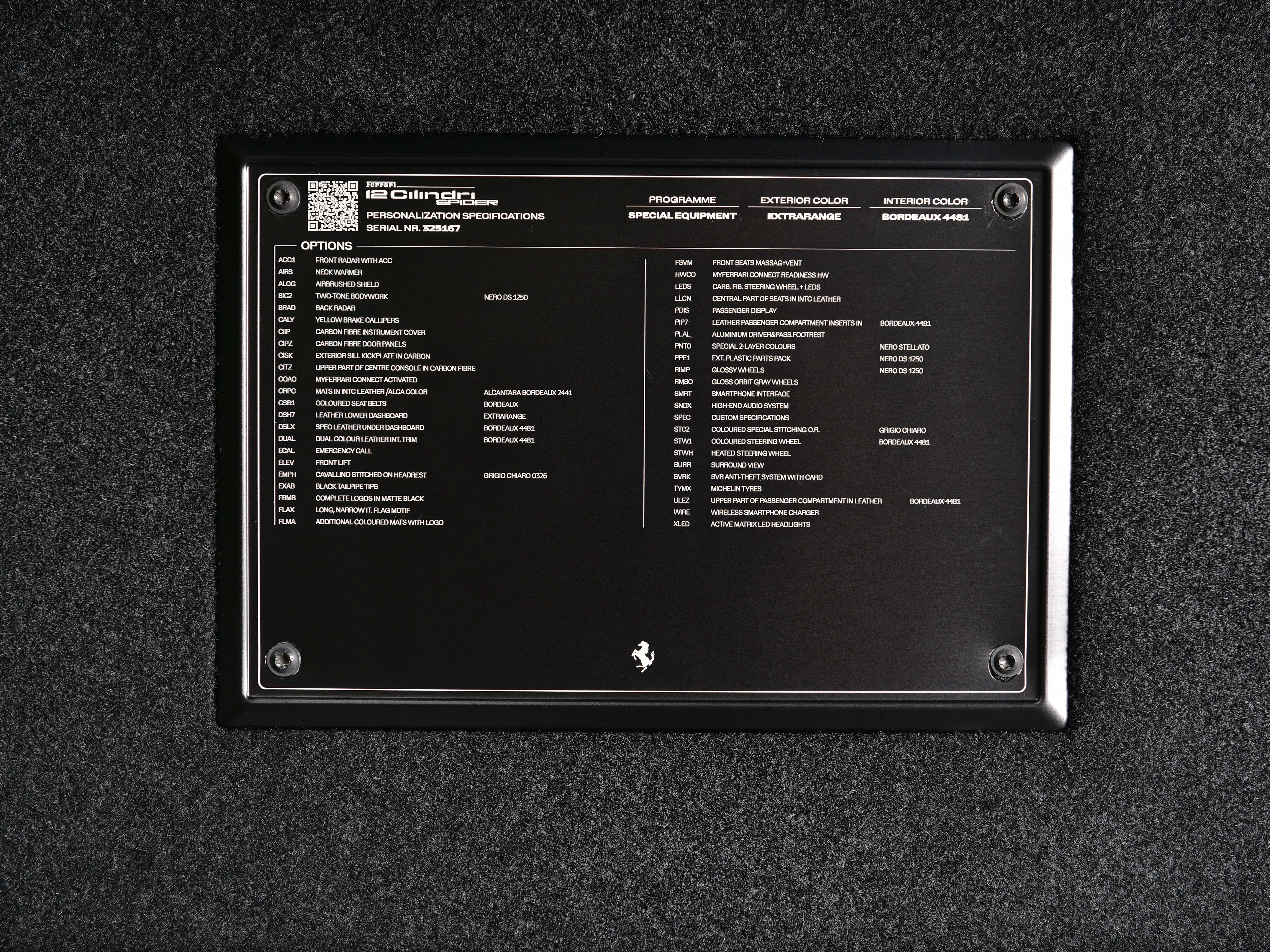 This delivery-mileage, UK-supplied example was commissioned to an outstanding specification, including: Extracampionario Nero Stellato (2-layer special paint), carbon fibre steering wheel with LED shift lights, carbon fibre exterior sill kicks, upper tunnel trim, instrument cluster and door panels, high-end audio system and passenger display, smartphone connection and wireless charger, leather racing seats in Bordeaux with massage, ventilation and neck-warmer functions, heated Bordeaux steering wheel with matching seat belts, embroidered Prancing Horse headrests in Chiaro Grigio, dual-colour leather interior with Bordeaux lower dashboard and Filo Speciale Grigio Chiaro stitching. Bordeaux mats with logo and aluminium footrests, suspension lifter, surround view, adaptive cruise control and radar safety systems, active Matrix LED headlights, Nero DS external painted pack and glossy painted Orbit rims in Nero DS, airbrushed Scuderia shields, long Italian flag and full badges in matt black, yellow brake calipers and black ceramic exhaust pipes and My Ferrari Connect; emergency call and tracker security system. In total, the cost new price was £494,160.01.
