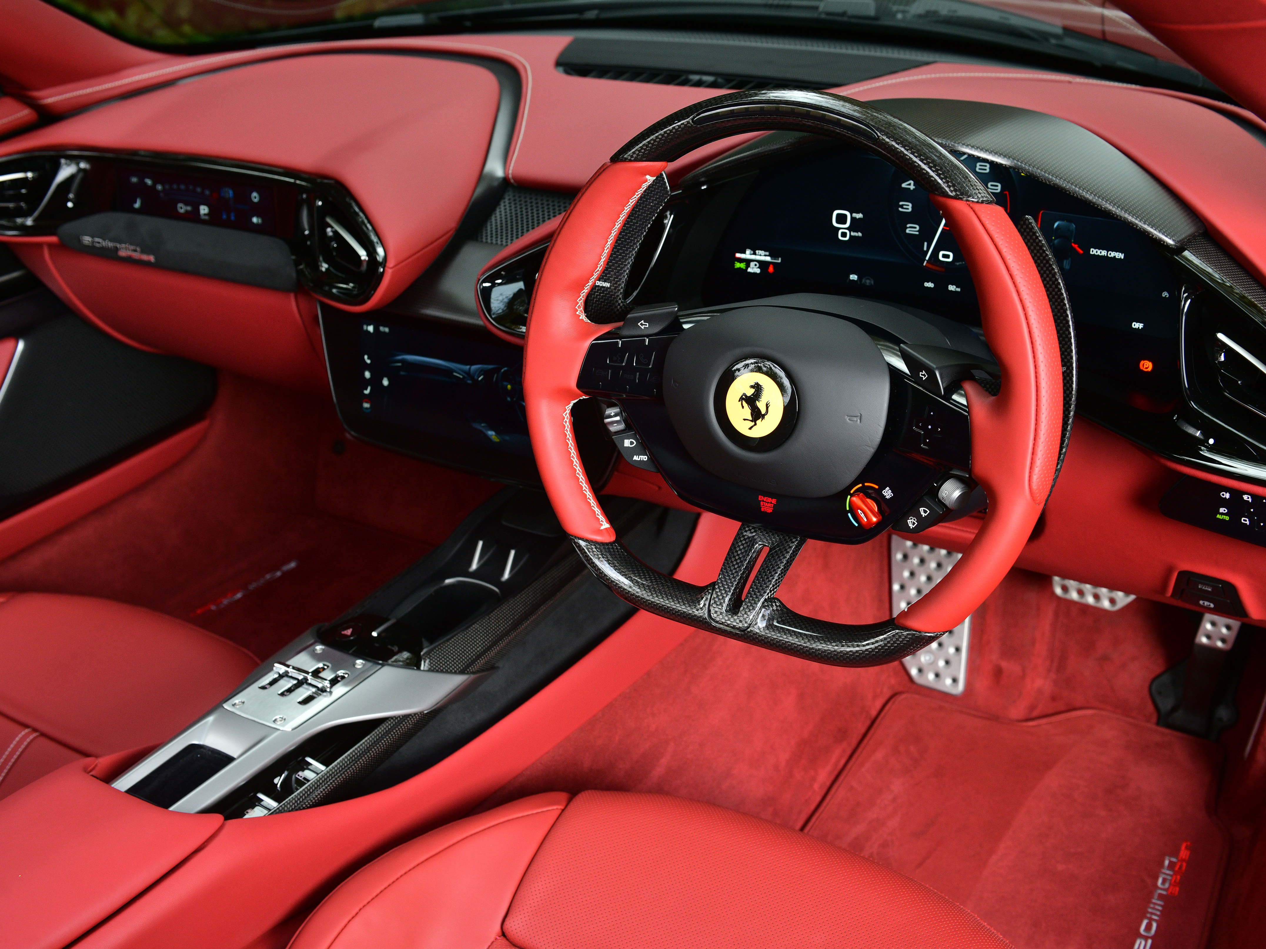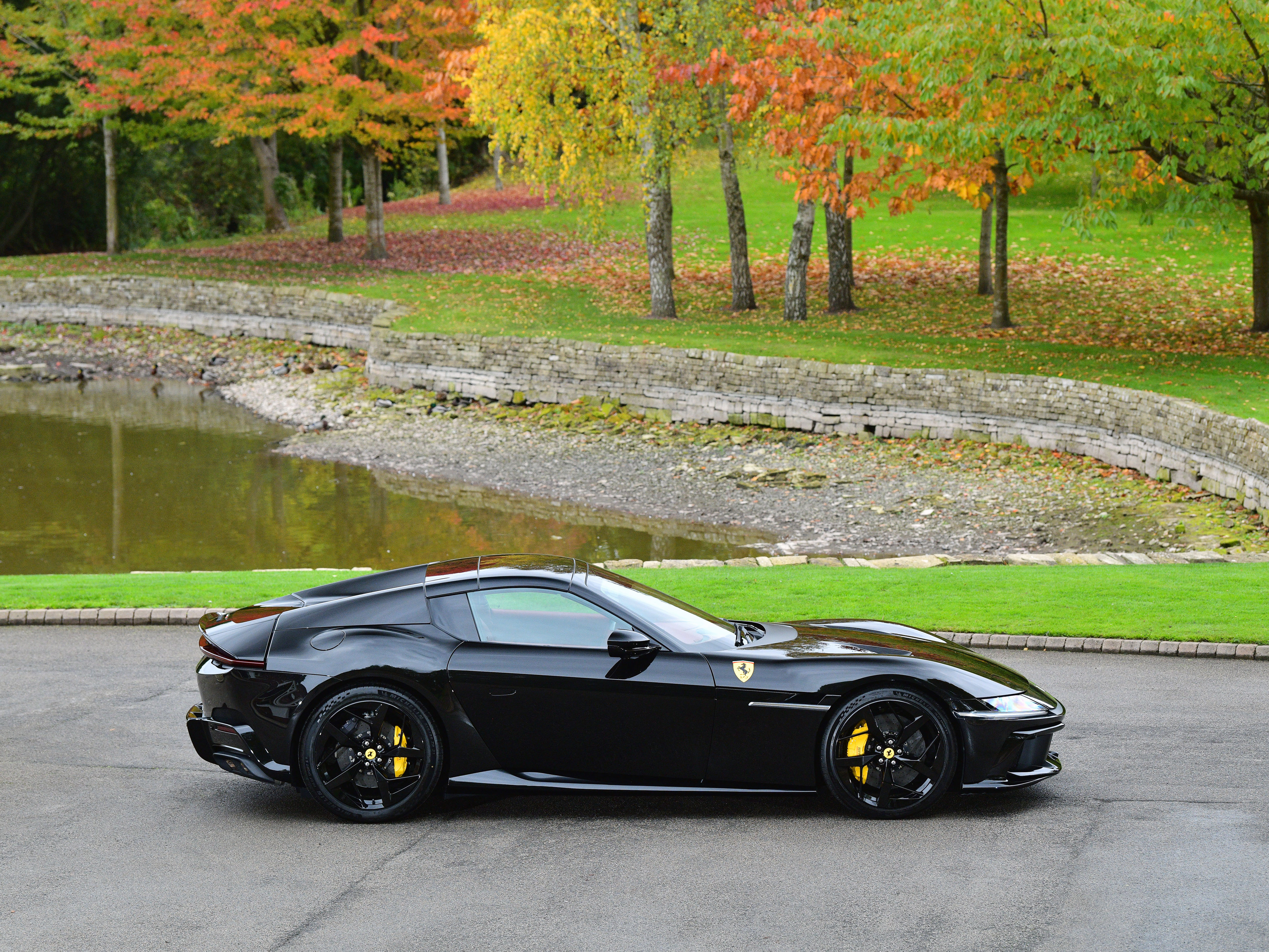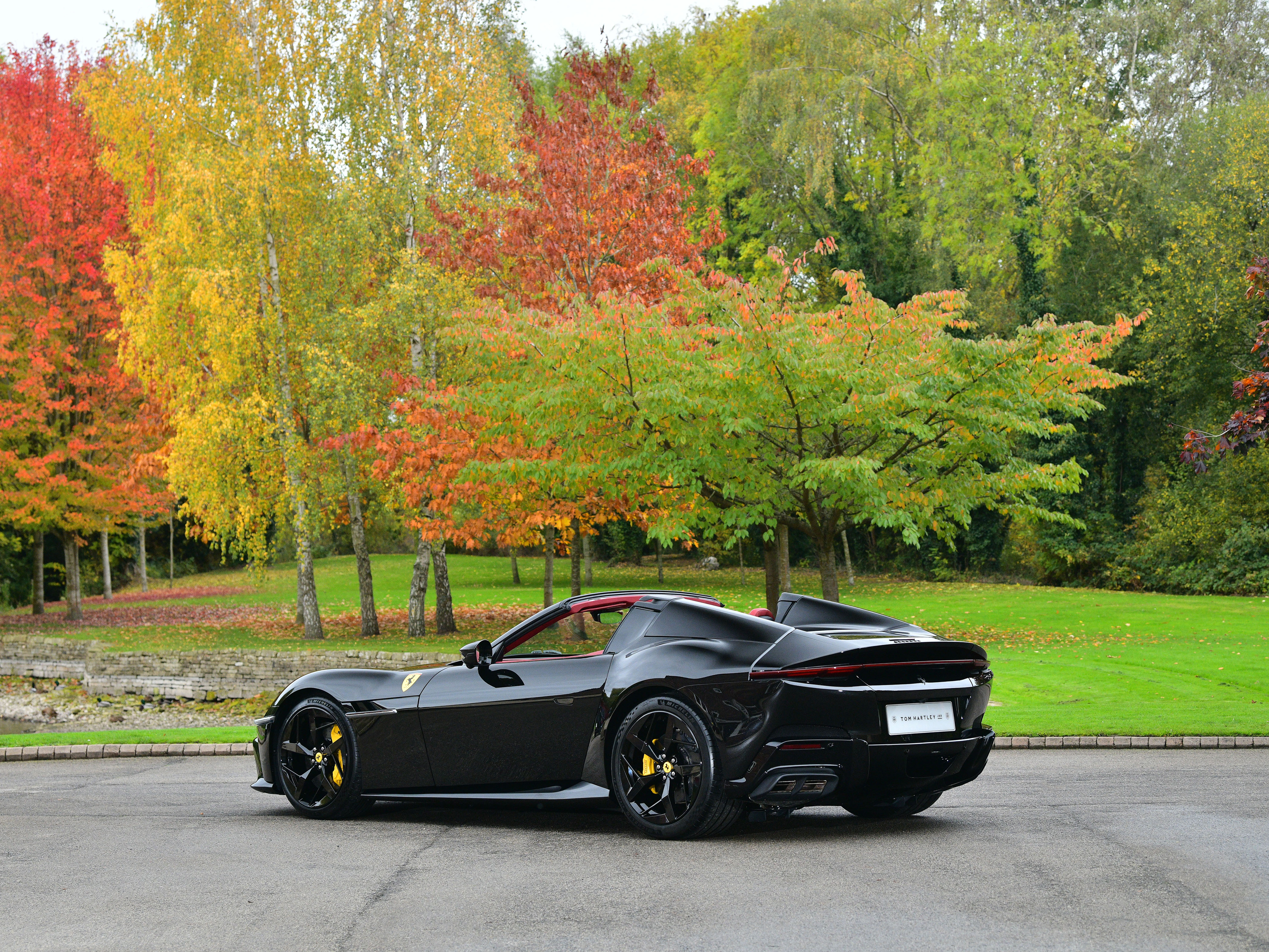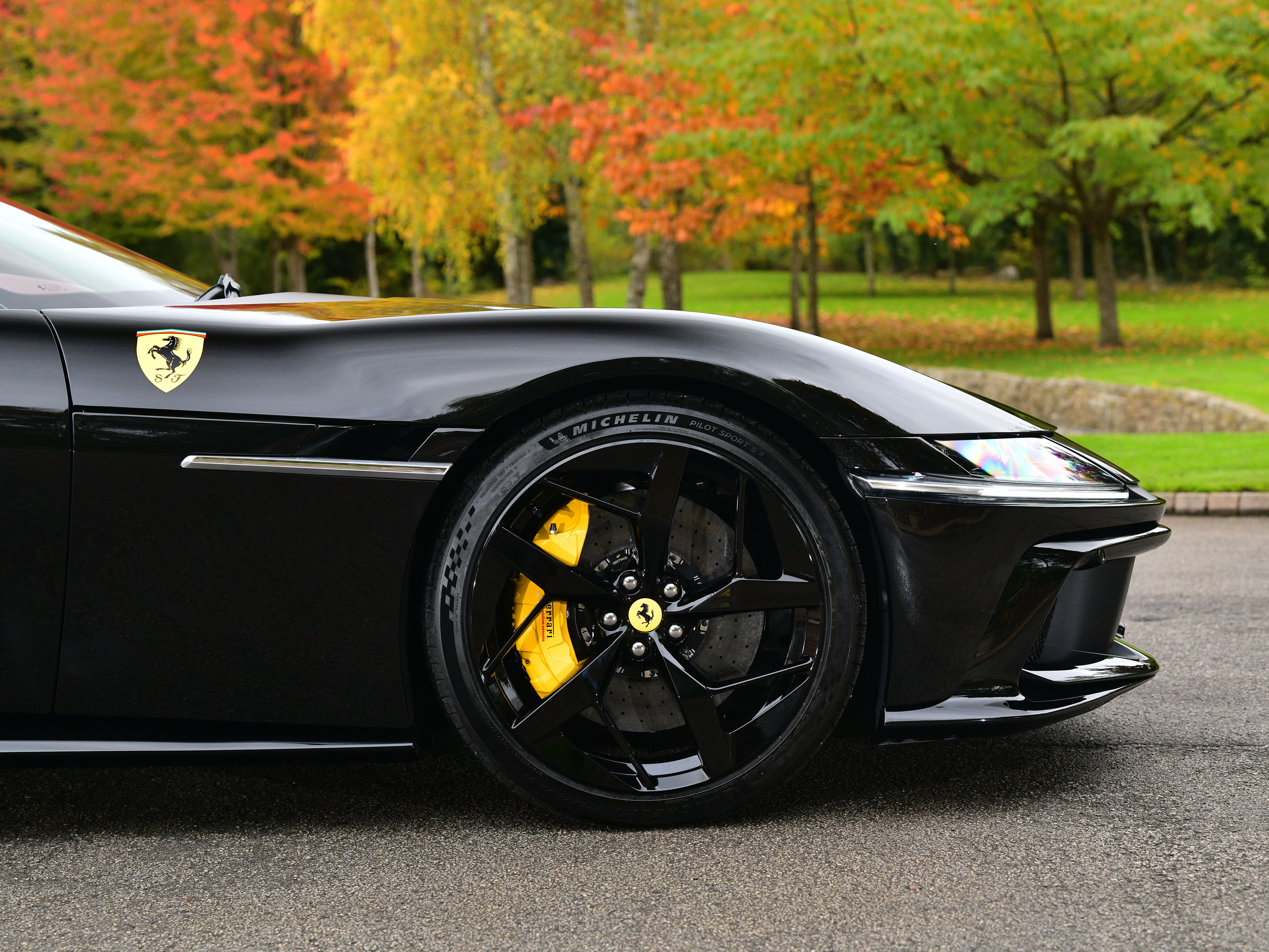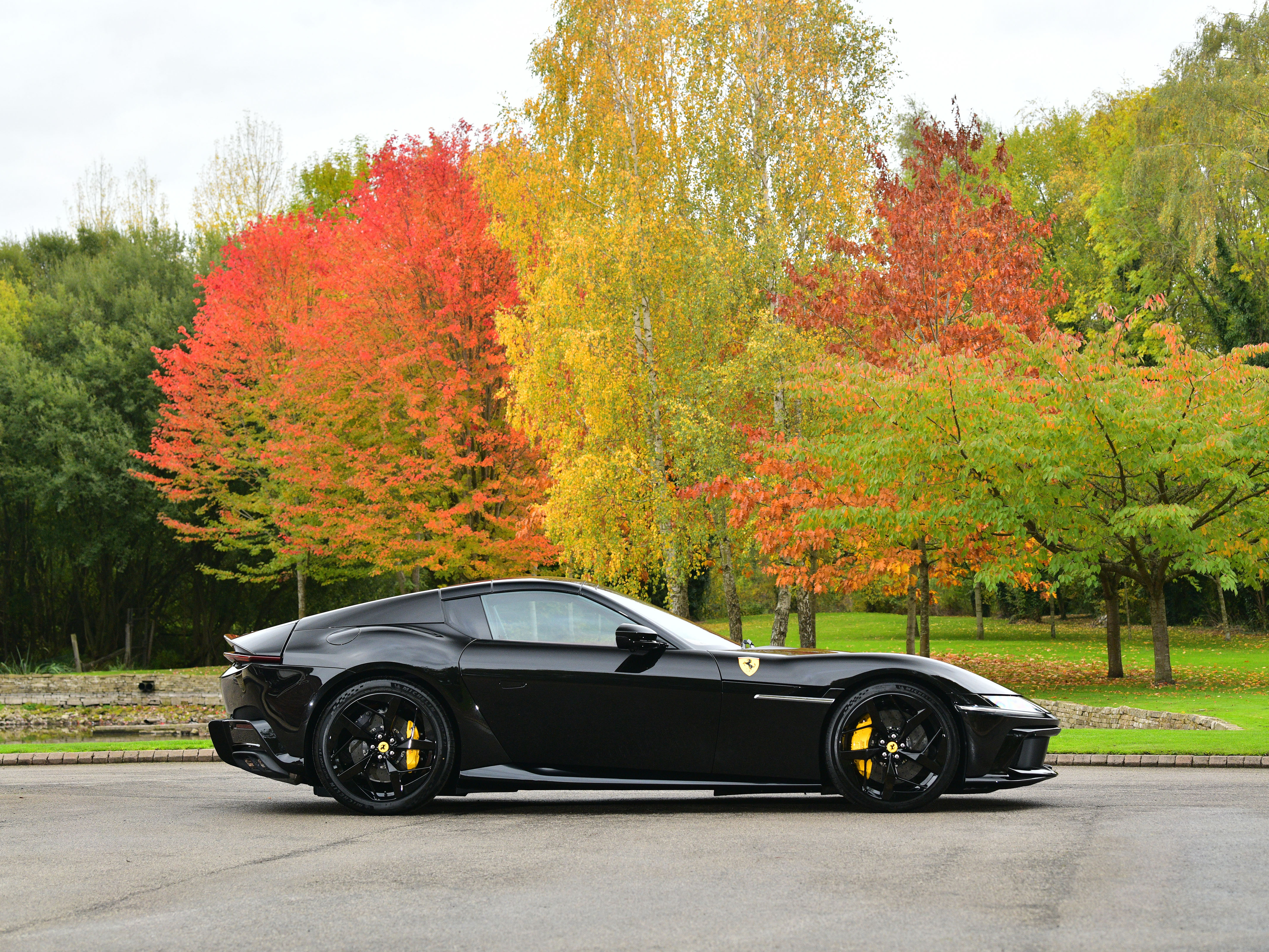 This delivery-mileage, UK-supplied example was commissioned to an outstanding specification, including: Extracampionario Nero Stellato (2-layer special paint), carbon fibre steering wheel with LED shift lights, carbon fibre exterior sill kicks, upper tunnel trim, instrument cluster and door panels, high-end audio system and passenger display, smartphone connection and wireless charger, leather racing seats in Bordeaux with massage, ventilation and neck-warmer functions, heated Bordeaux steering wheel with matching seat belts, embroidered Prancing Horse headrests in Chiaro Grigio, dual-colour leather interior with Bordeaux lower dashboard and Filo Speciale Grigio Chiaro stitching. Bordeaux mats with logo and aluminium footrests, suspension lifter, surround view, adaptive cruise control and radar safety systems, active Matrix LED headlights, Nero DS external painted pack and glossy painted Orbit rims in Nero DS, airbrushed Scuderia shields, long Italian flag and full badges in matt black, yellow brake calipers and black ceramic exhaust pipes and My Ferrari Connect; emergency call and tracker security system. In total, the cost new price was £494,160.01.