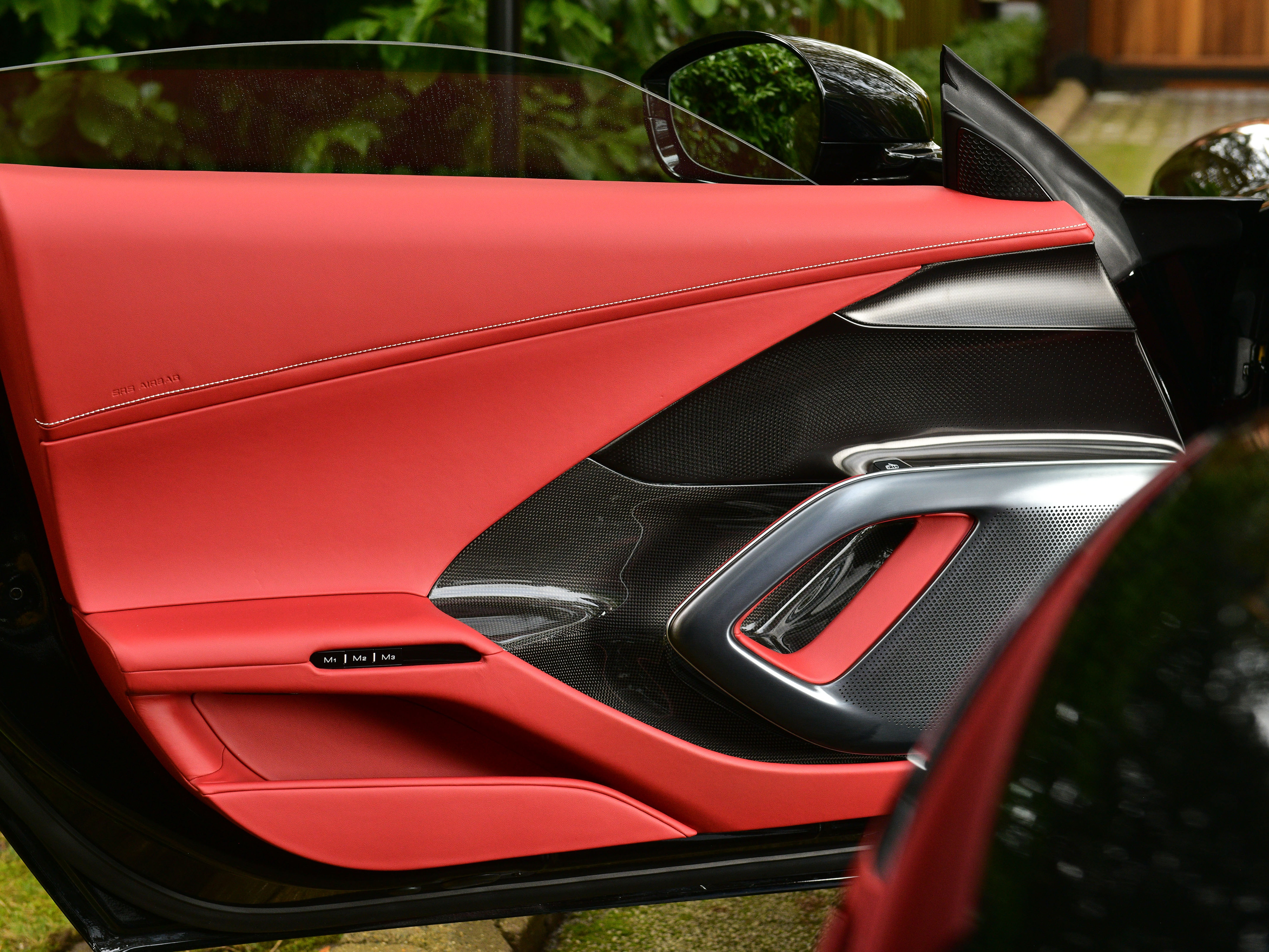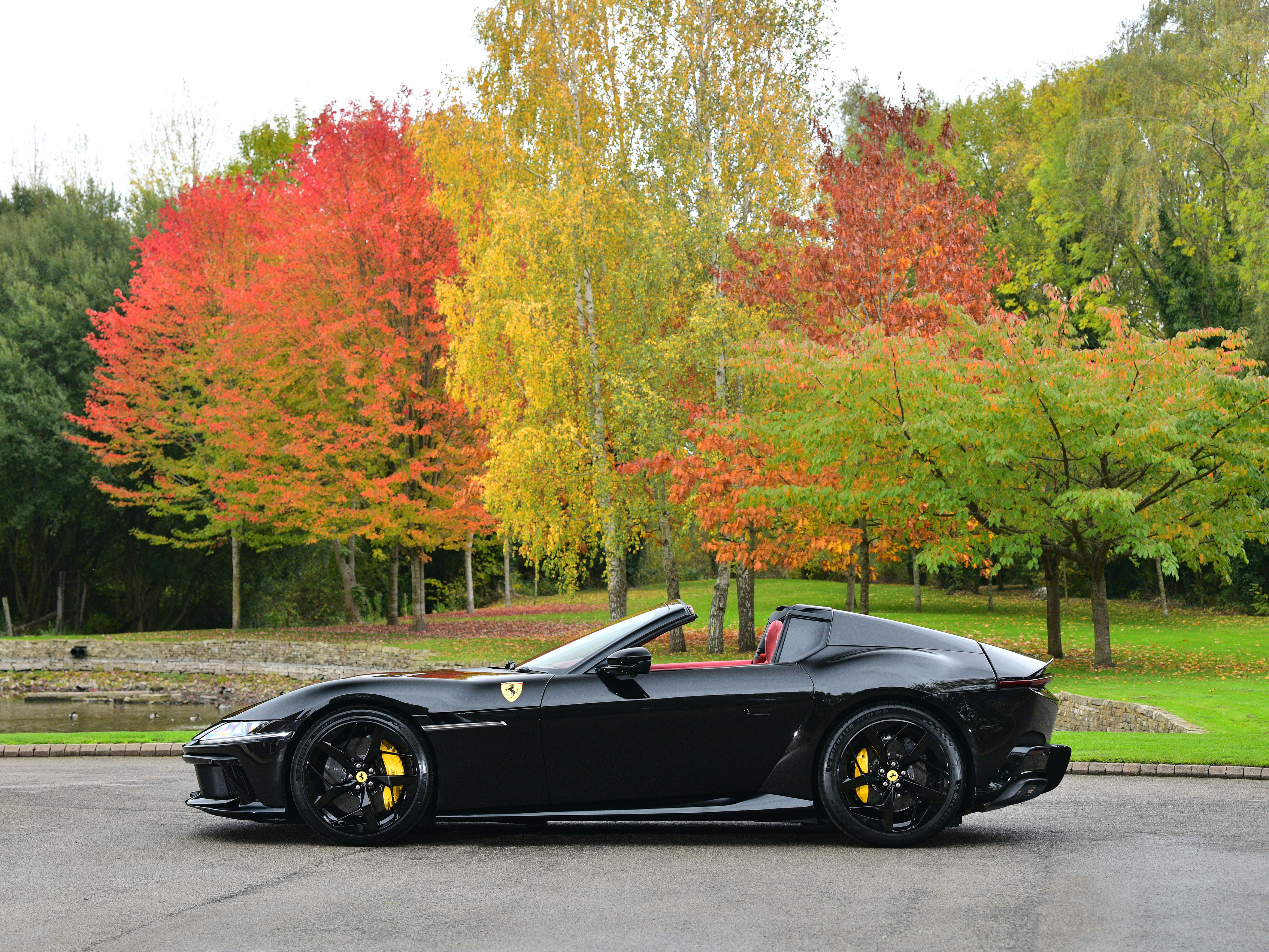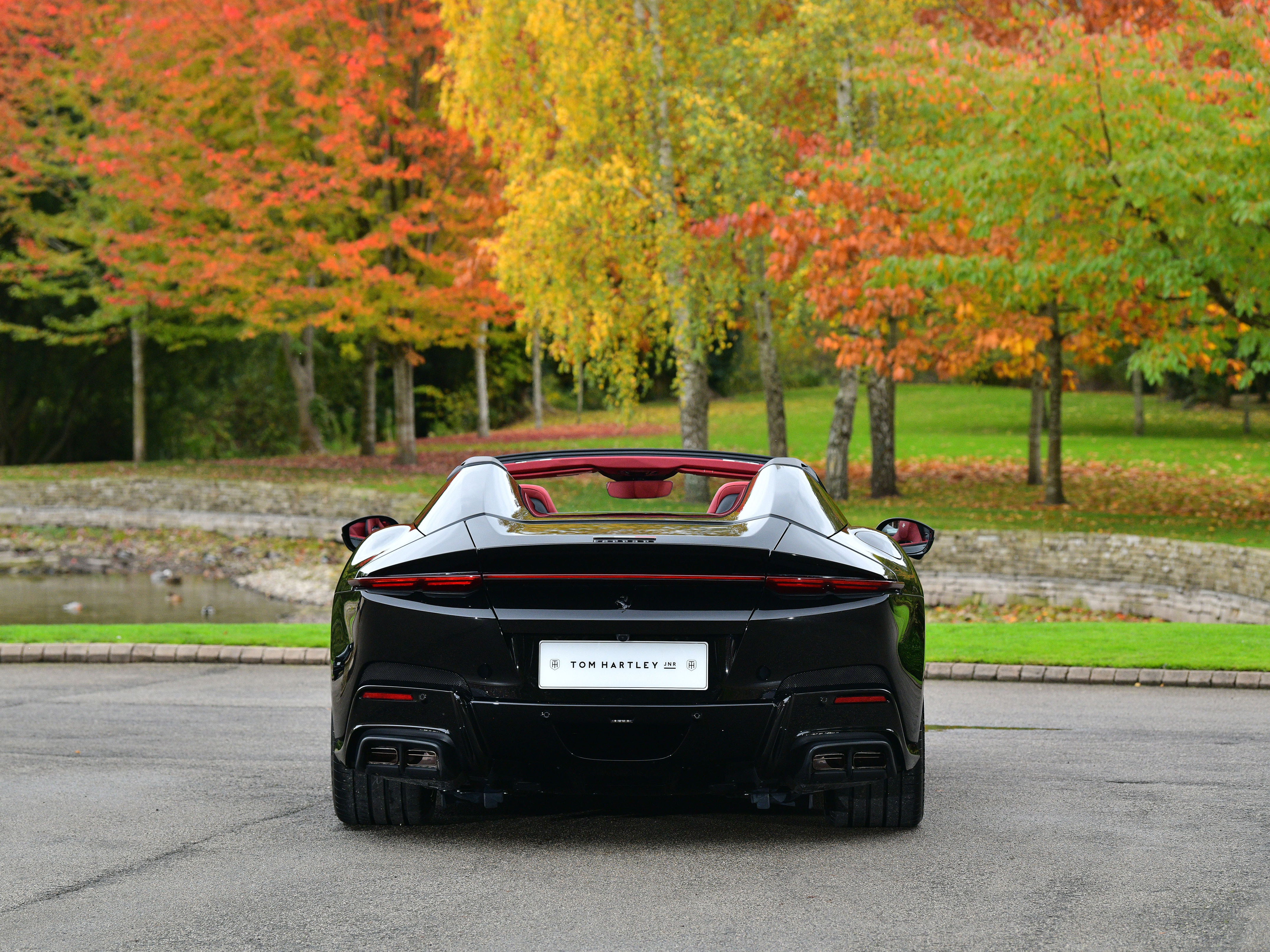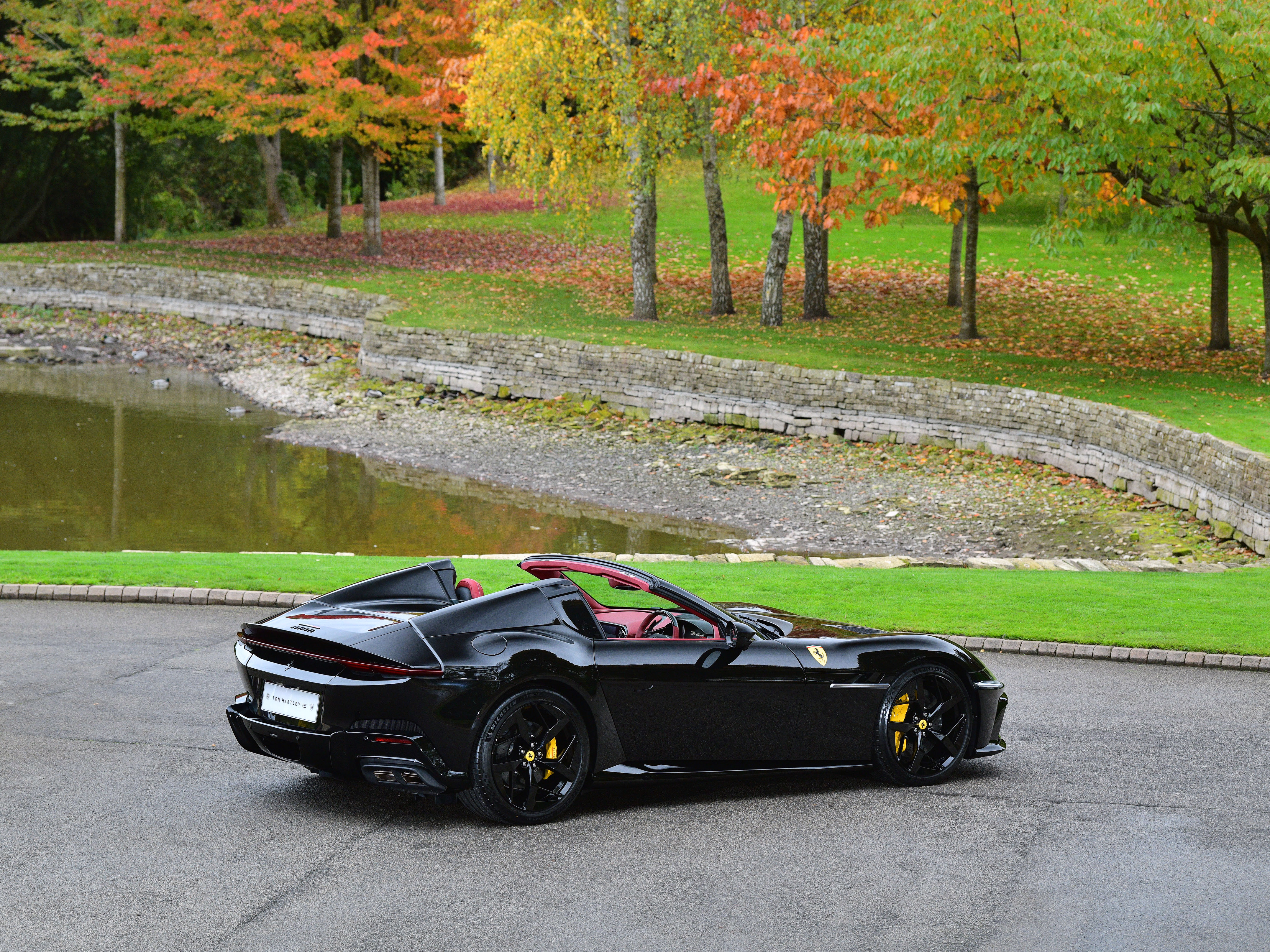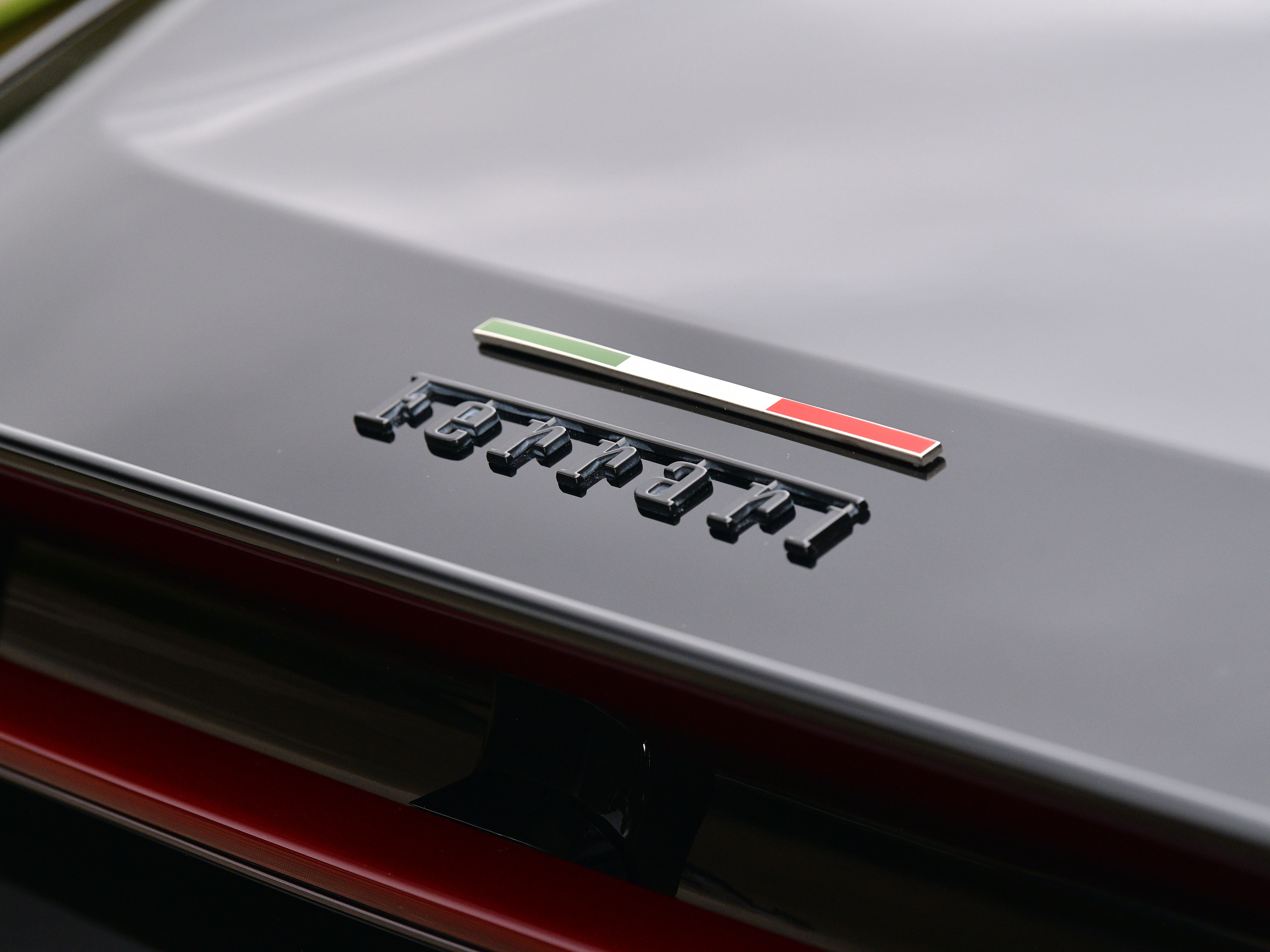 This delivery-mileage, UK-supplied example was commissioned to an outstanding specification, including: Extracampionario Nero Stellato (2-layer special paint), carbon fibre steering wheel with LED shift lights, carbon fibre exterior sill kicks, upper tunnel trim, instrument cluster and door panels, high-end audio system and passenger display, smartphone connection and wireless charger, leather racing seats in Bordeaux with massage, ventilation and neck-warmer functions, heated Bordeaux steering wheel with matching seat belts, embroidered Prancing Horse headrests in Chiaro Grigio, dual-colour leather interior with Bordeaux lower dashboard and Filo Speciale Grigio Chiaro stitching. Bordeaux mats with logo and aluminium footrests, suspension lifter, surround view, adaptive cruise control and radar safety systems, active Matrix LED headlights, Nero DS external painted pack and glossy painted Orbit rims in Nero DS, airbrushed Scuderia shields, long Italian flag and full badges in matt black, yellow brake calipers and black ceramic exhaust pipes and My Ferrari Connect; emergency call and tracker security system. In total, the cost new price was £494,160.01.
