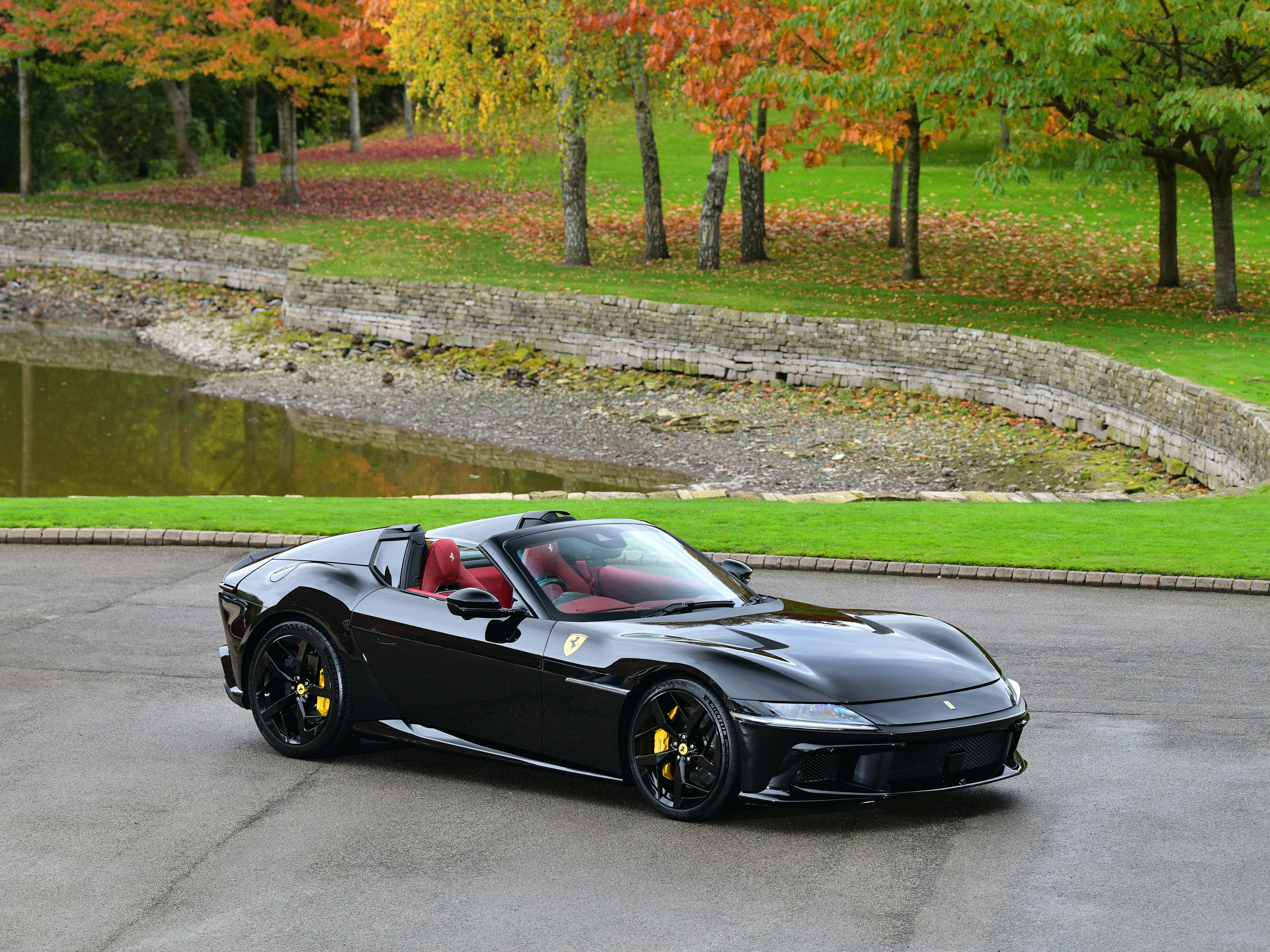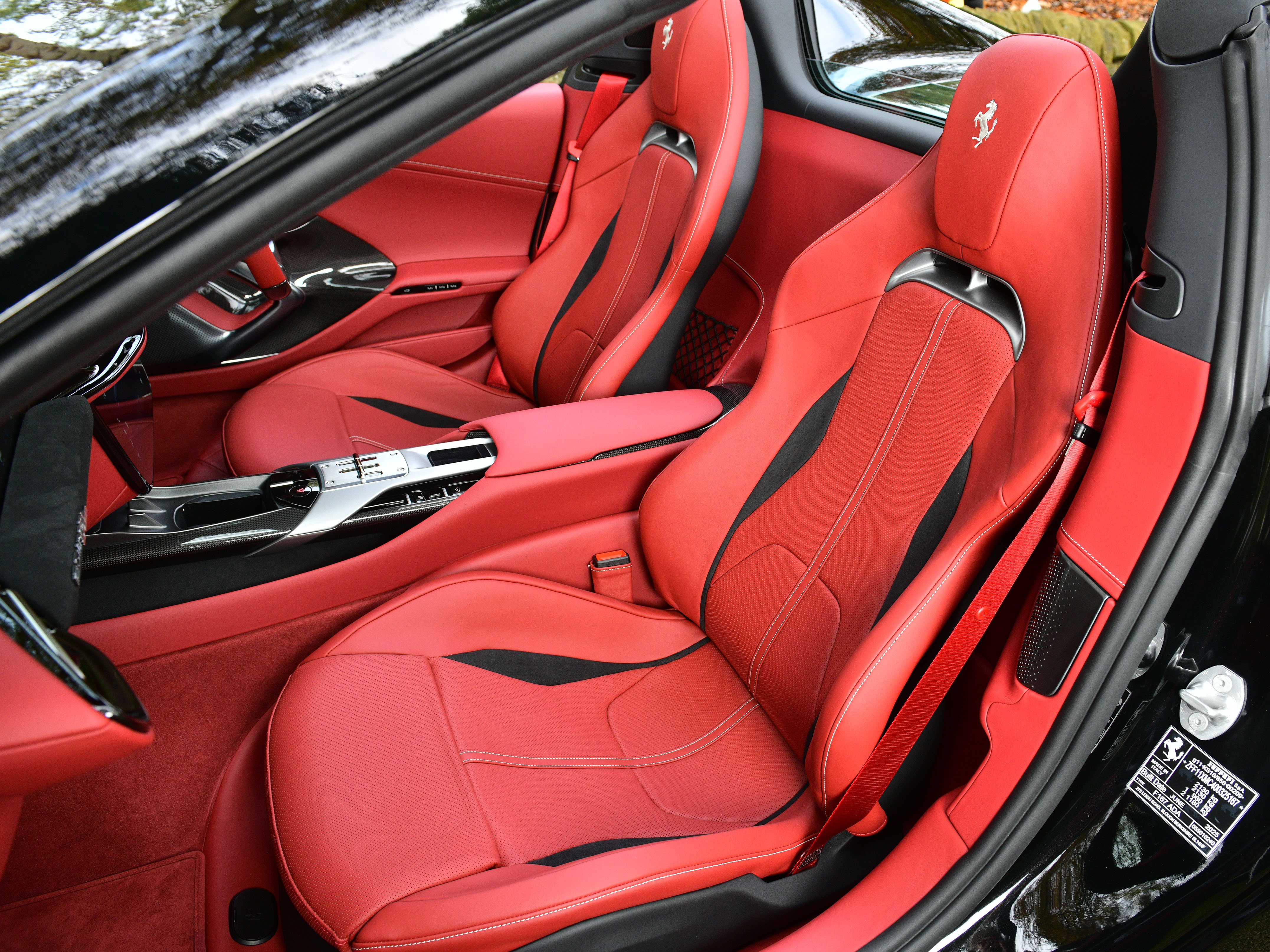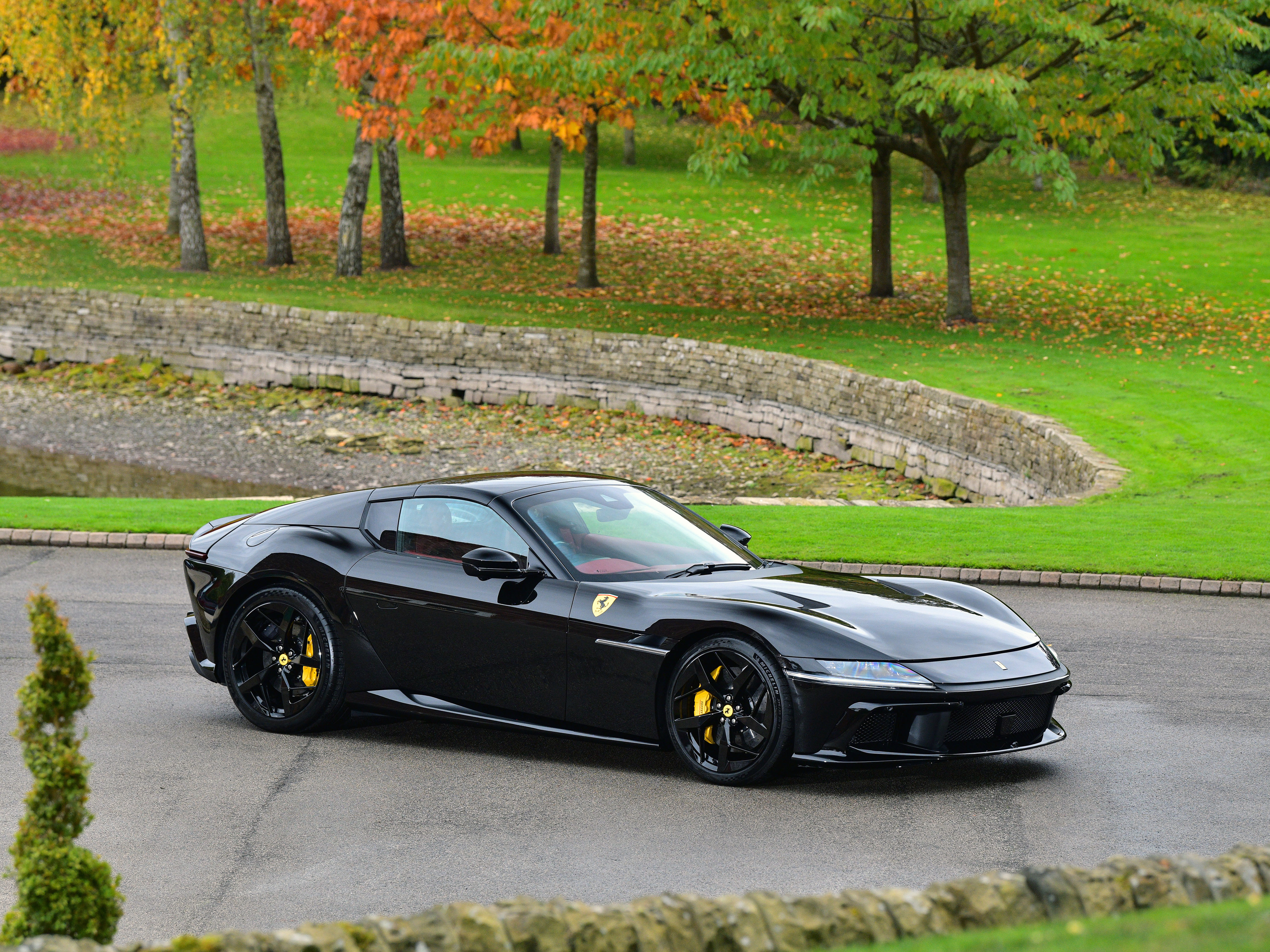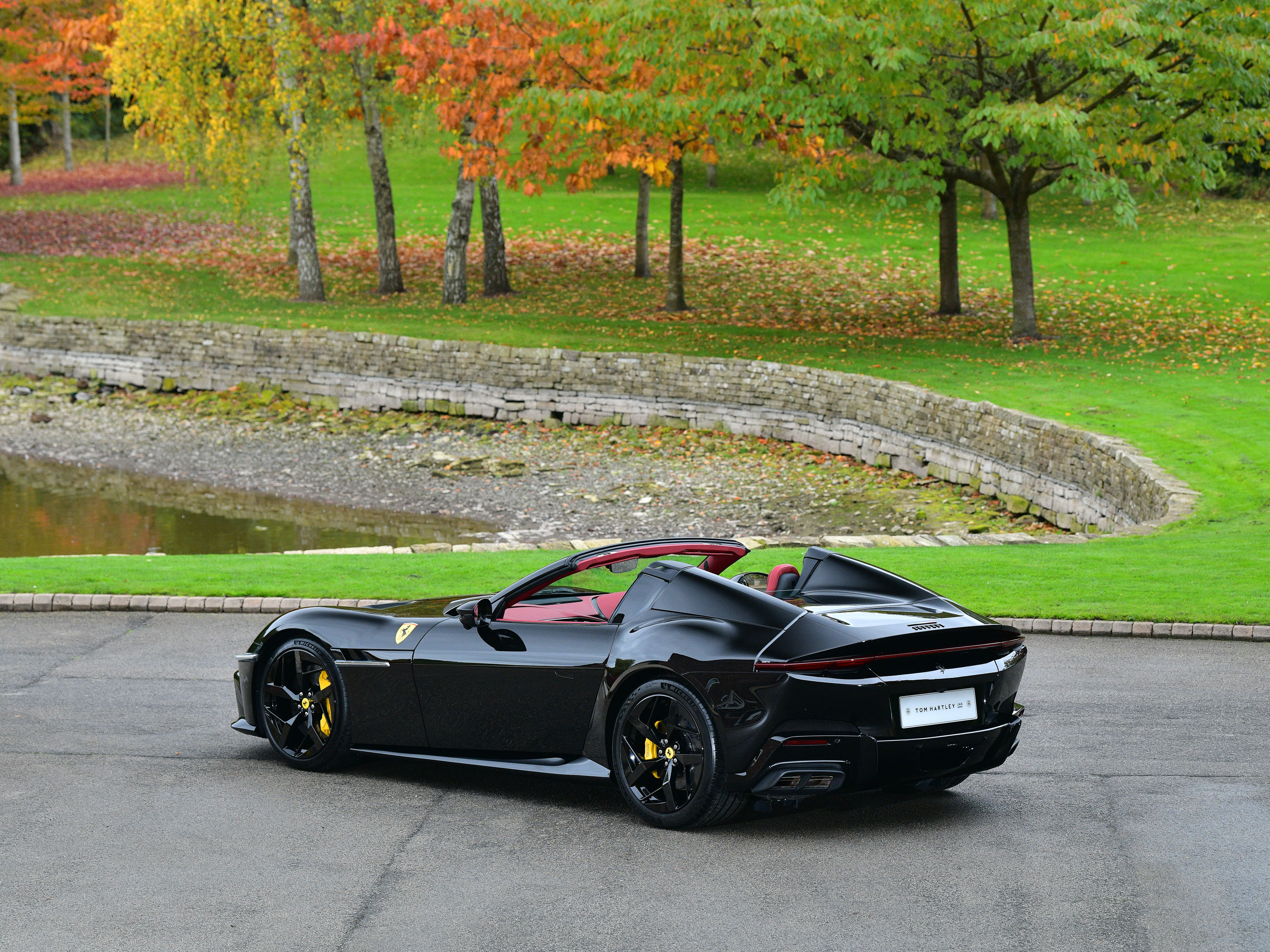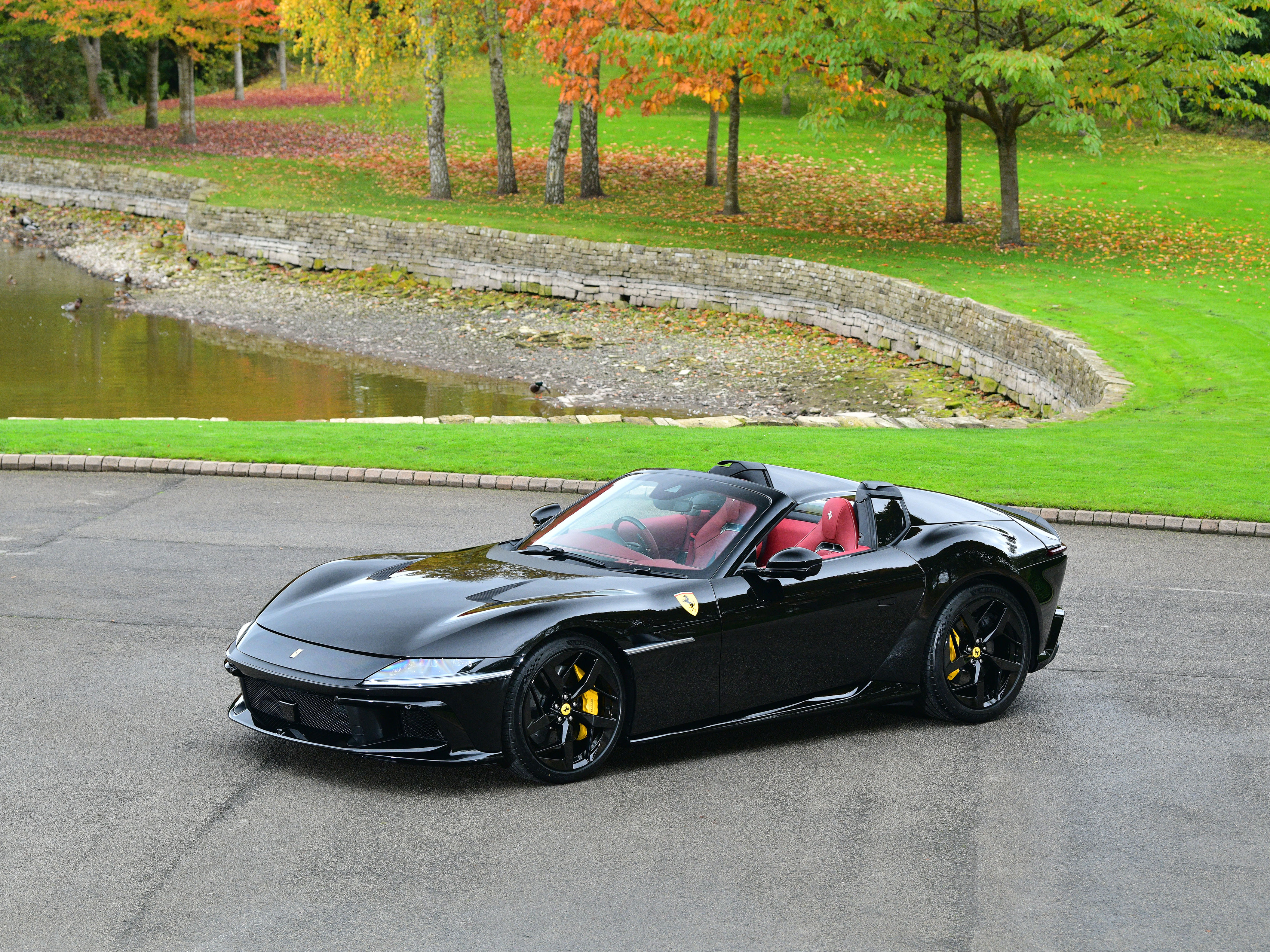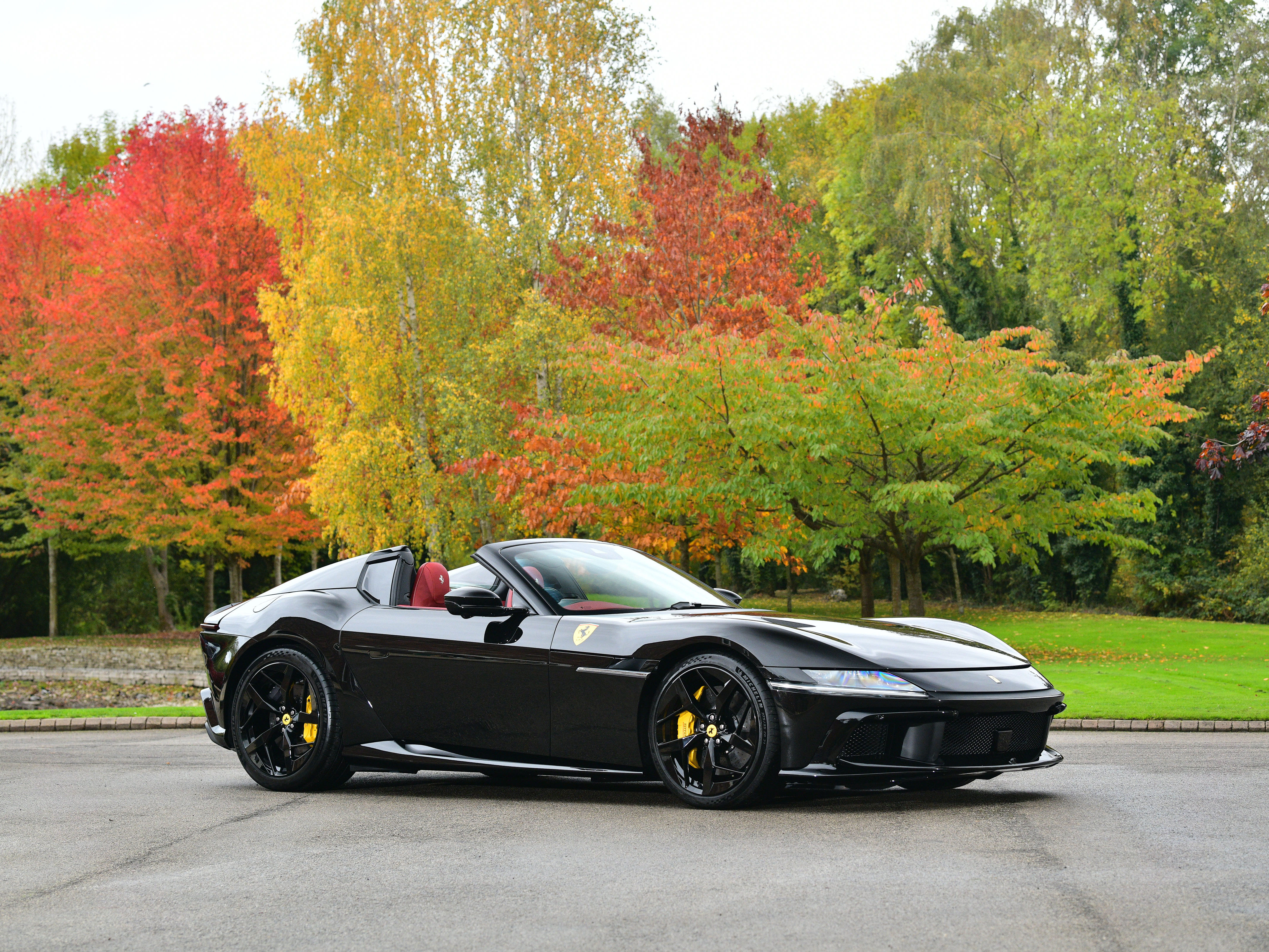 This delivery-mileage, UK-supplied example was commissioned to an outstanding specification, including: Extracampionario Nero Stellato (2-layer special paint), carbon fibre steering wheel with LED shift lights, carbon fibre exterior sill kicks, upper tunnel trim, instrument cluster and door panels, high-end audio system and passenger display, smartphone connection and wireless charger, leather racing seats in Bordeaux with massage, ventilation and neck-warmer functions, heated Bordeaux steering wheel with matching seat belts, embroidered Prancing Horse headrests in Chiaro Grigio, dual-colour leather interior with Bordeaux lower dashboard and Filo Speciale Grigio Chiaro stitching. Bordeaux mats with logo and aluminium footrests, suspension lifter, surround view, adaptive cruise control and radar safety systems, active Matrix LED headlights, Nero DS external painted pack and glossy painted Orbit rims in Nero DS, airbrushed Scuderia shields, long Italian flag and full badges in matt black, yellow brake calipers and black ceramic exhaust pipes and My Ferrari Connect; emergency call and tracker security system. In total, the cost new price was £494,160.01.