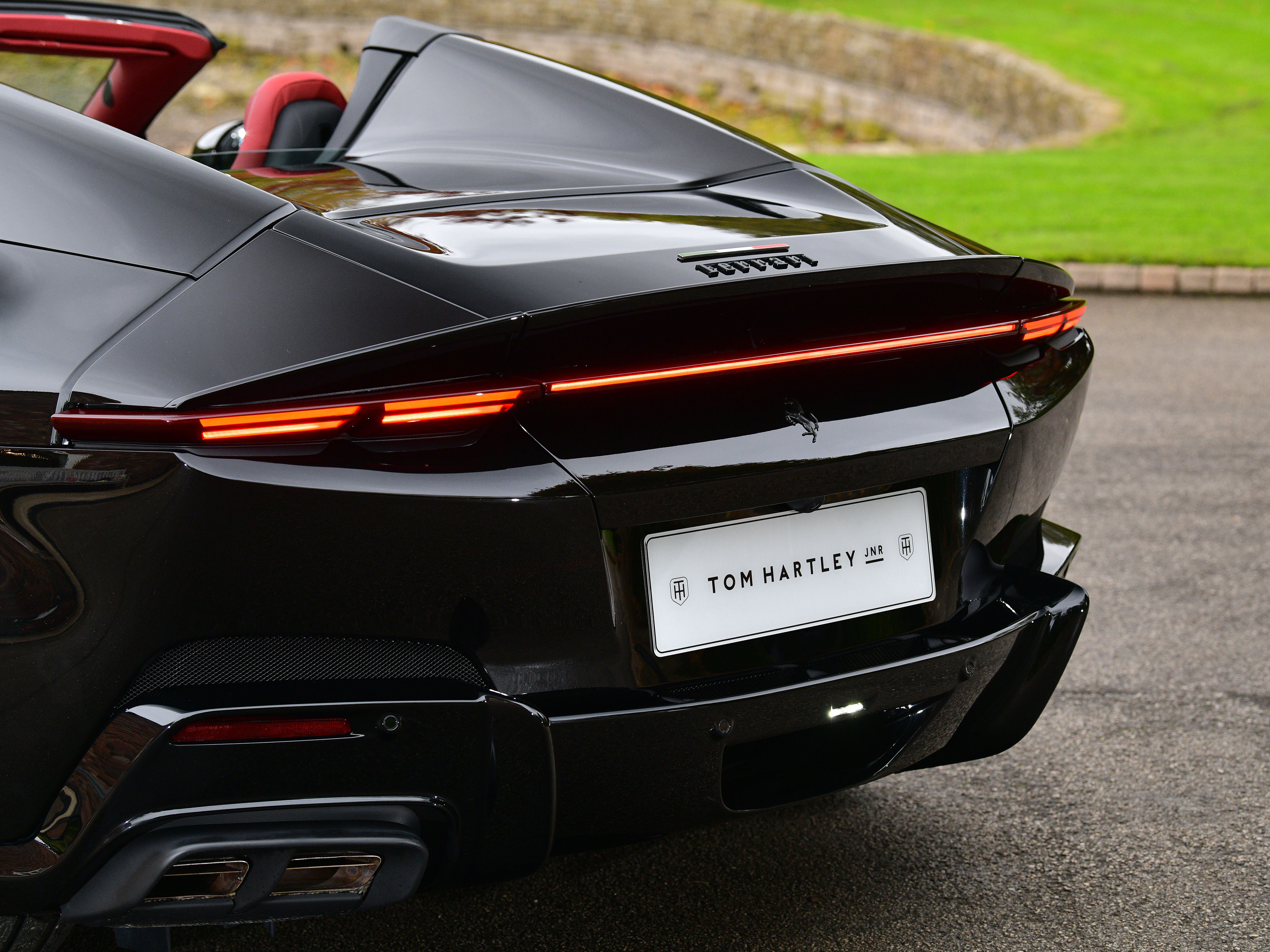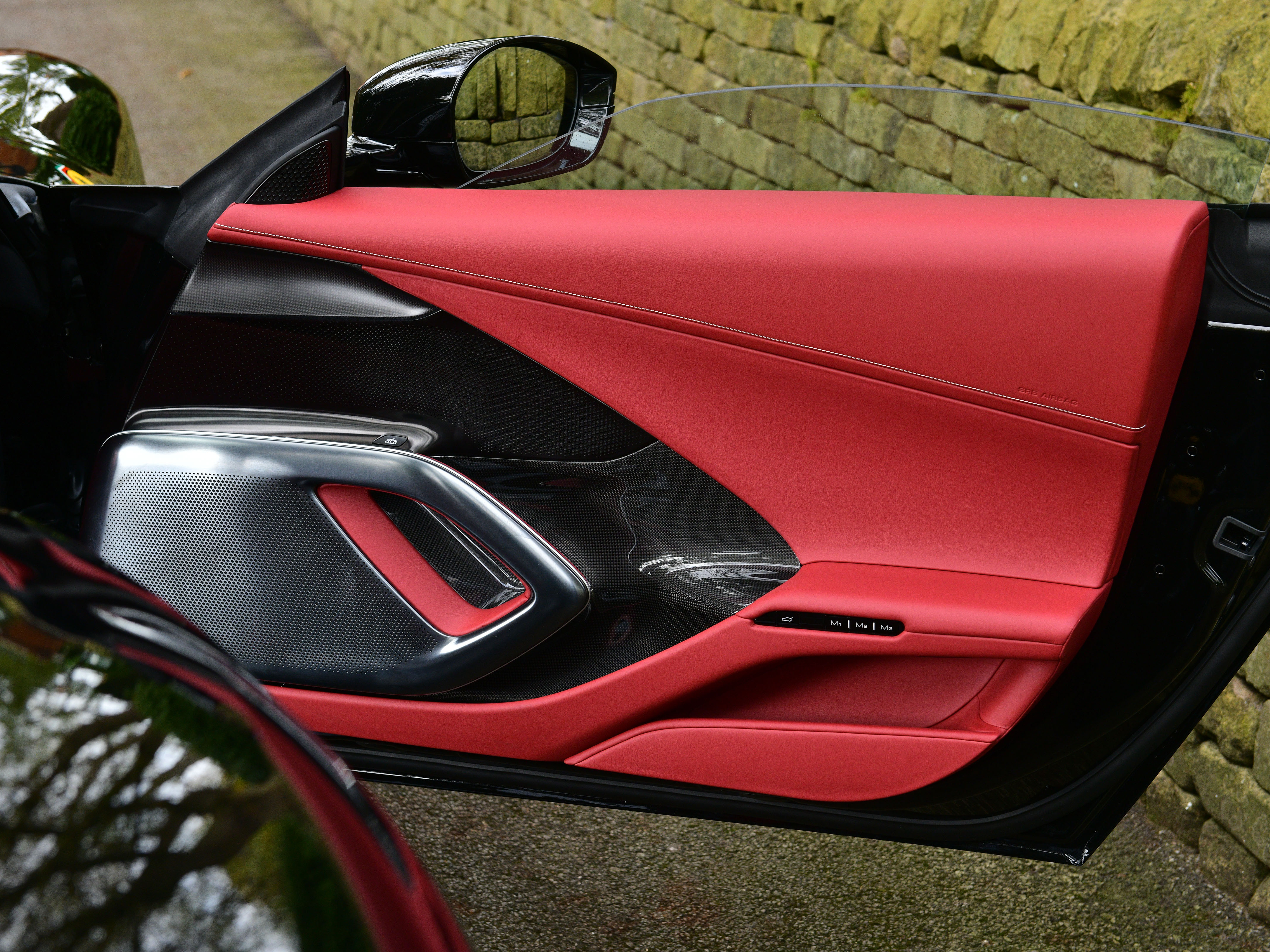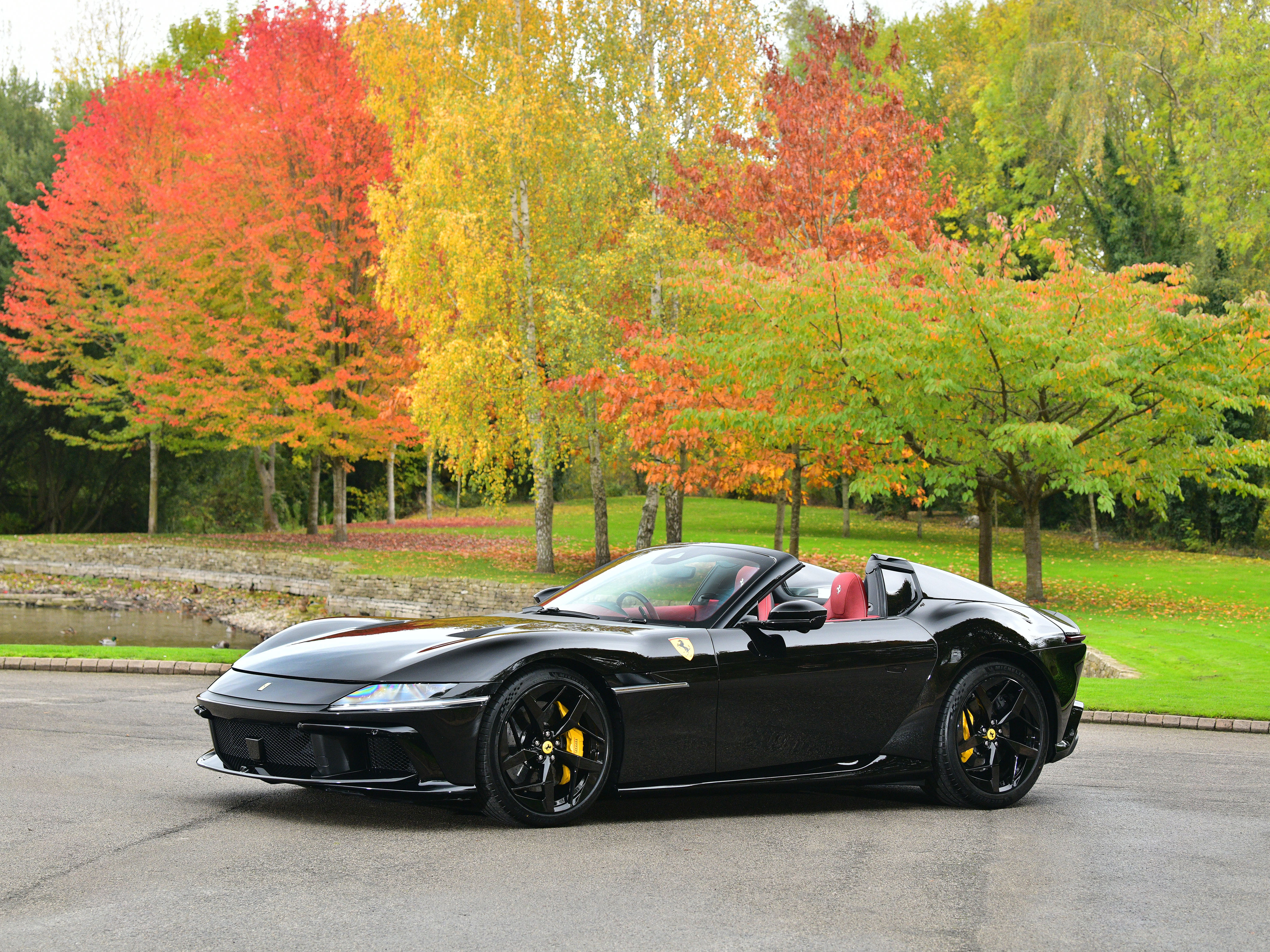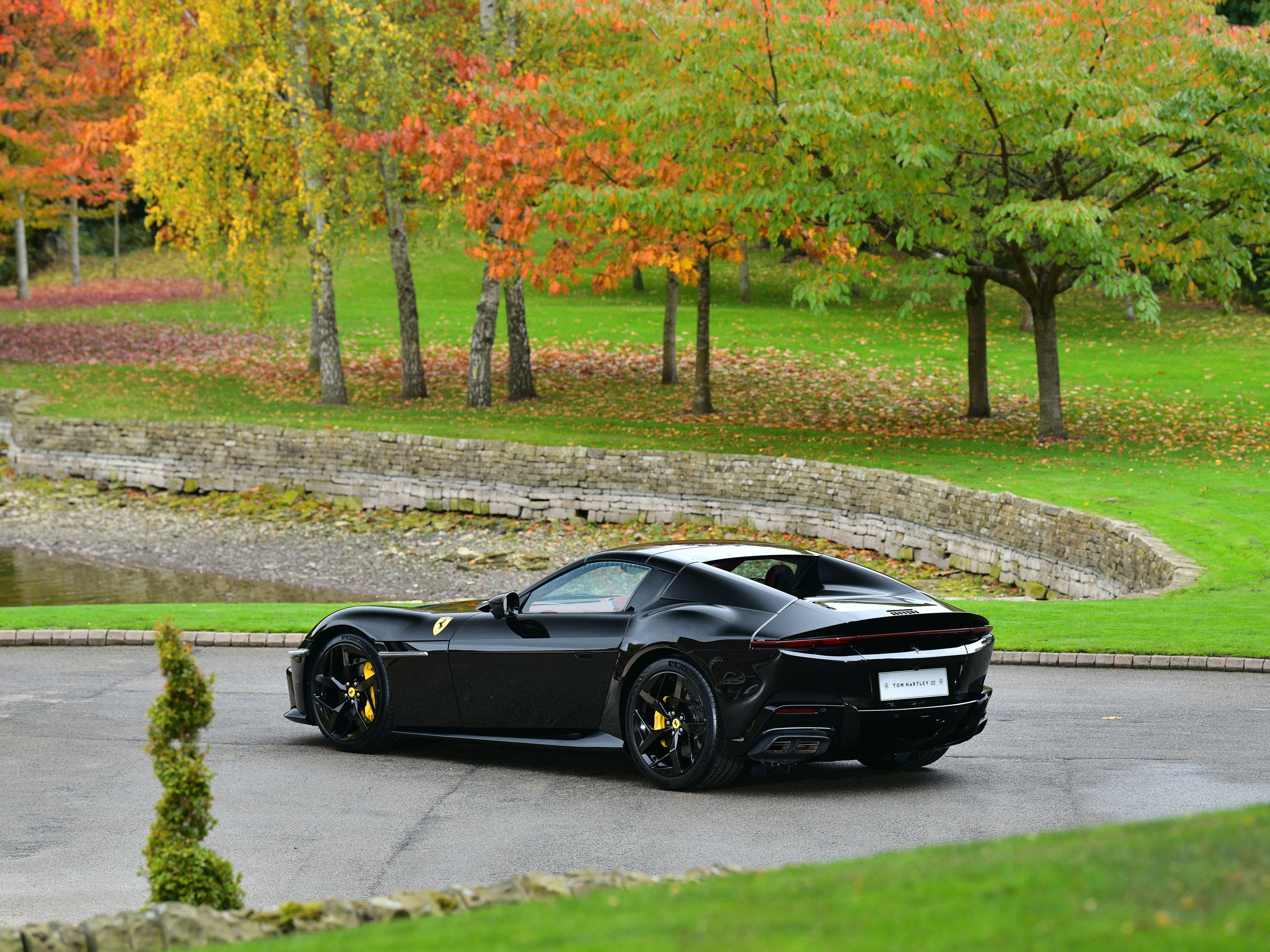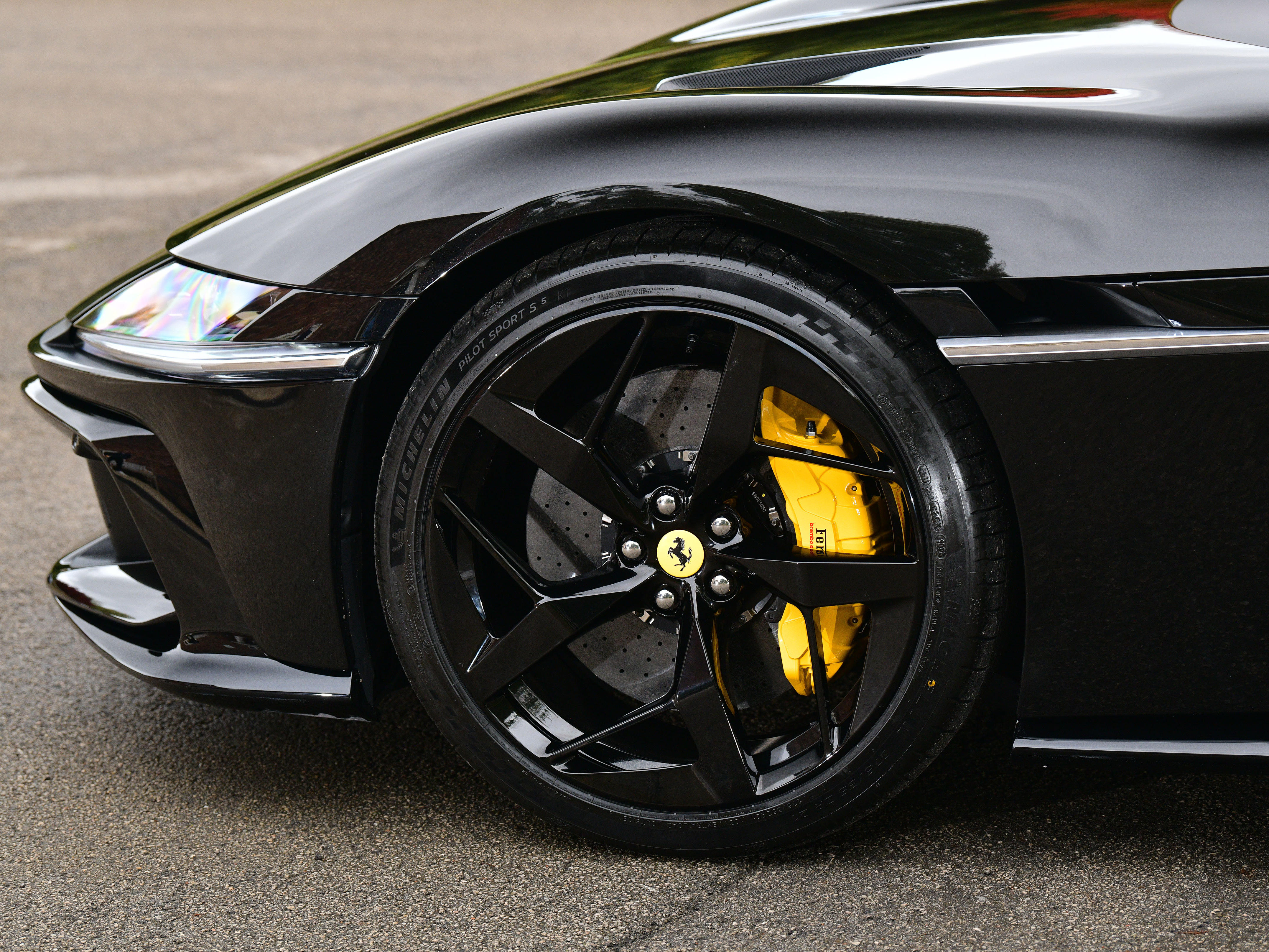 This delivery-mileage, UK-supplied example was commissioned to an outstanding specification, including: Extracampionario Nero Stellato (2-layer special paint), carbon fibre steering wheel with LED shift lights, carbon fibre exterior sill kicks, upper tunnel trim, instrument cluster and door panels, high-end audio system and passenger display, smartphone connection and wireless charger, leather racing seats in Bordeaux with massage, ventilation and neck-warmer functions, heated Bordeaux steering wheel with matching seat belts, embroidered Prancing Horse headrests in Chiaro Grigio, dual-colour leather interior with Bordeaux lower dashboard and Filo Speciale Grigio Chiaro stitching. Bordeaux mats with logo and aluminium footrests, suspension lifter, surround view, adaptive cruise control and radar safety systems, active Matrix LED headlights, Nero DS external painted pack and glossy painted Orbit rims in Nero DS, airbrushed Scuderia shields, long Italian flag and full badges in matt black, yellow brake calipers and black ceramic exhaust pipes and My Ferrari Connect; emergency call and tracker security system. In total, the cost new price was £494,160.01.