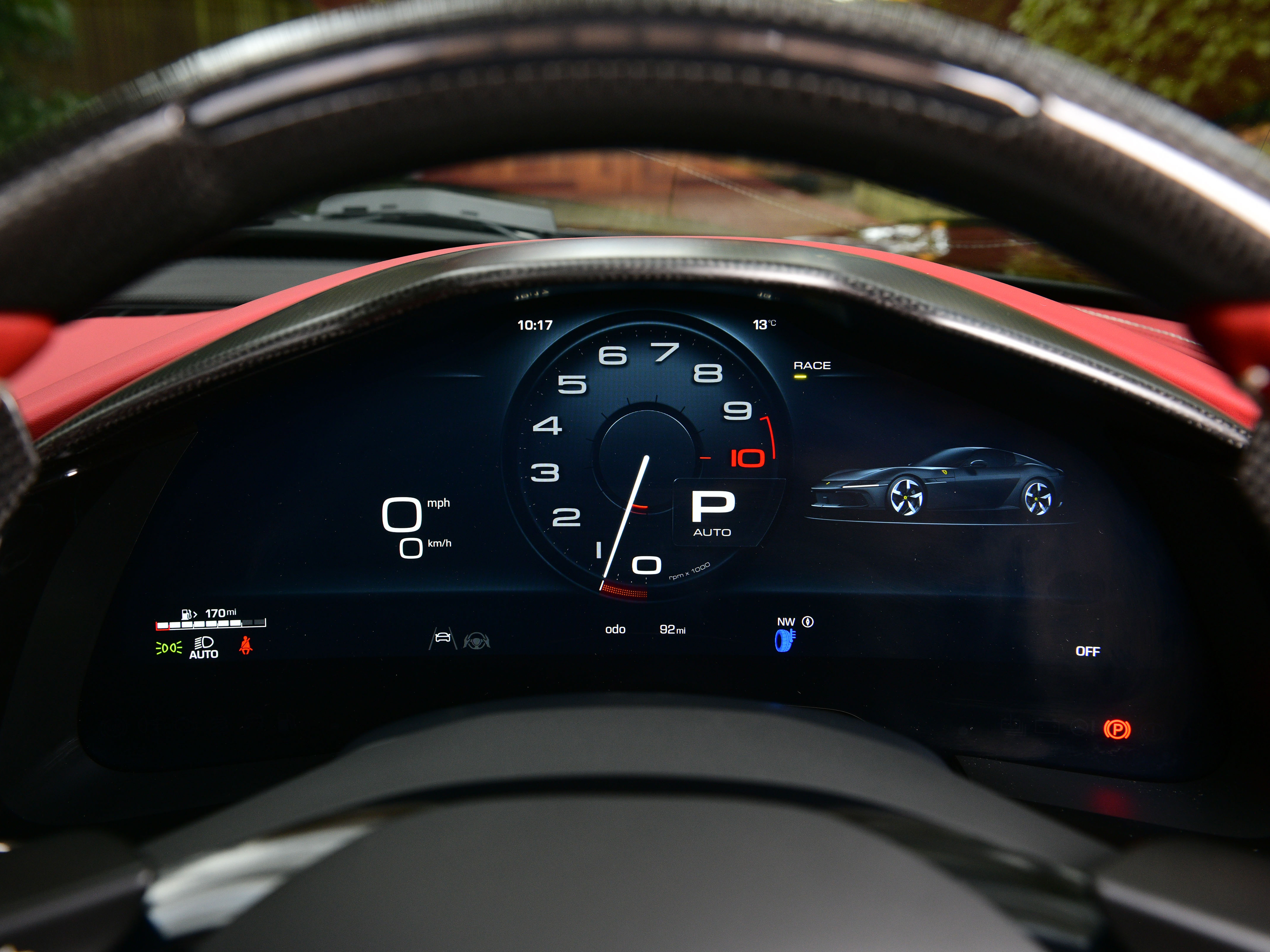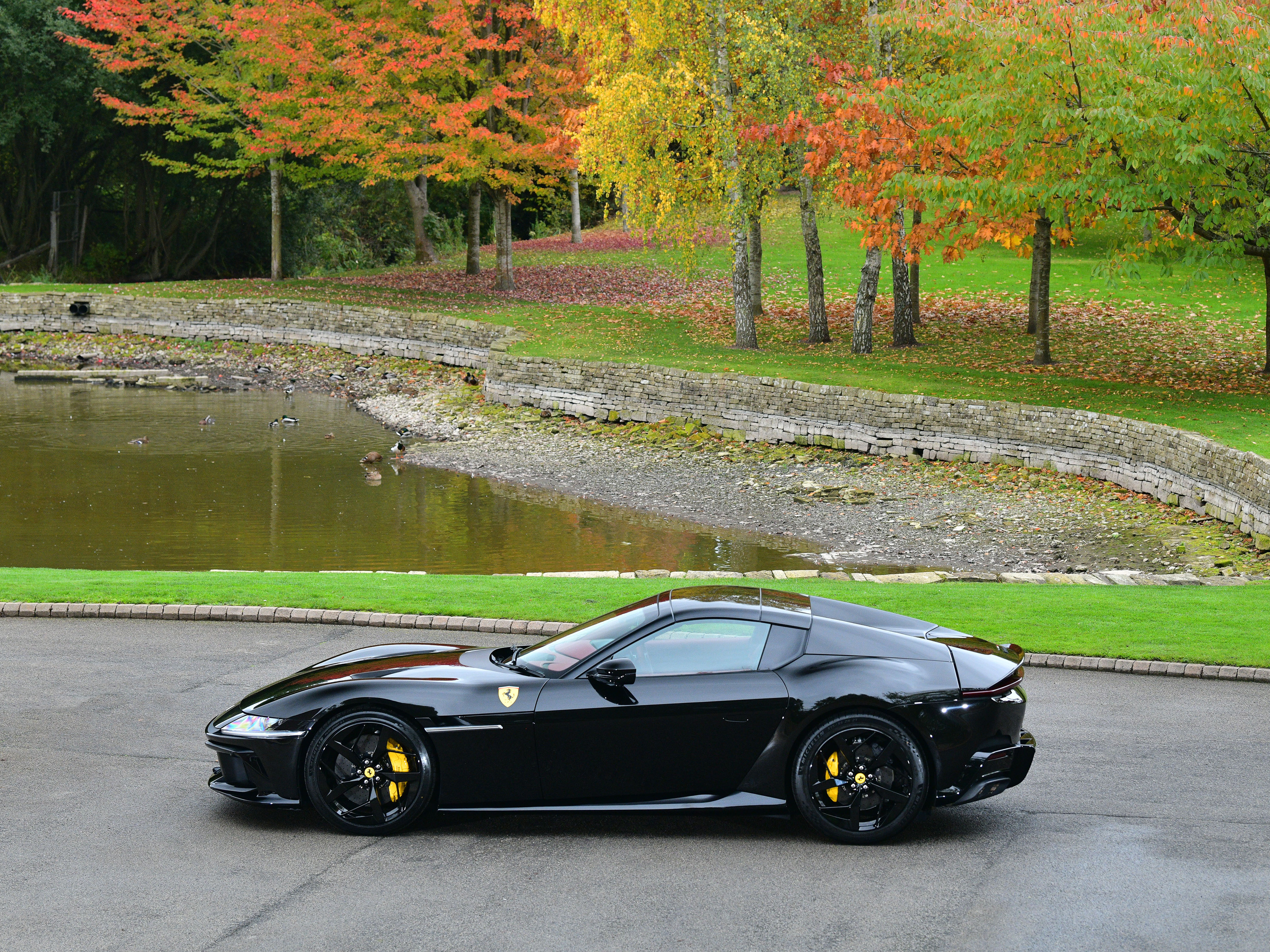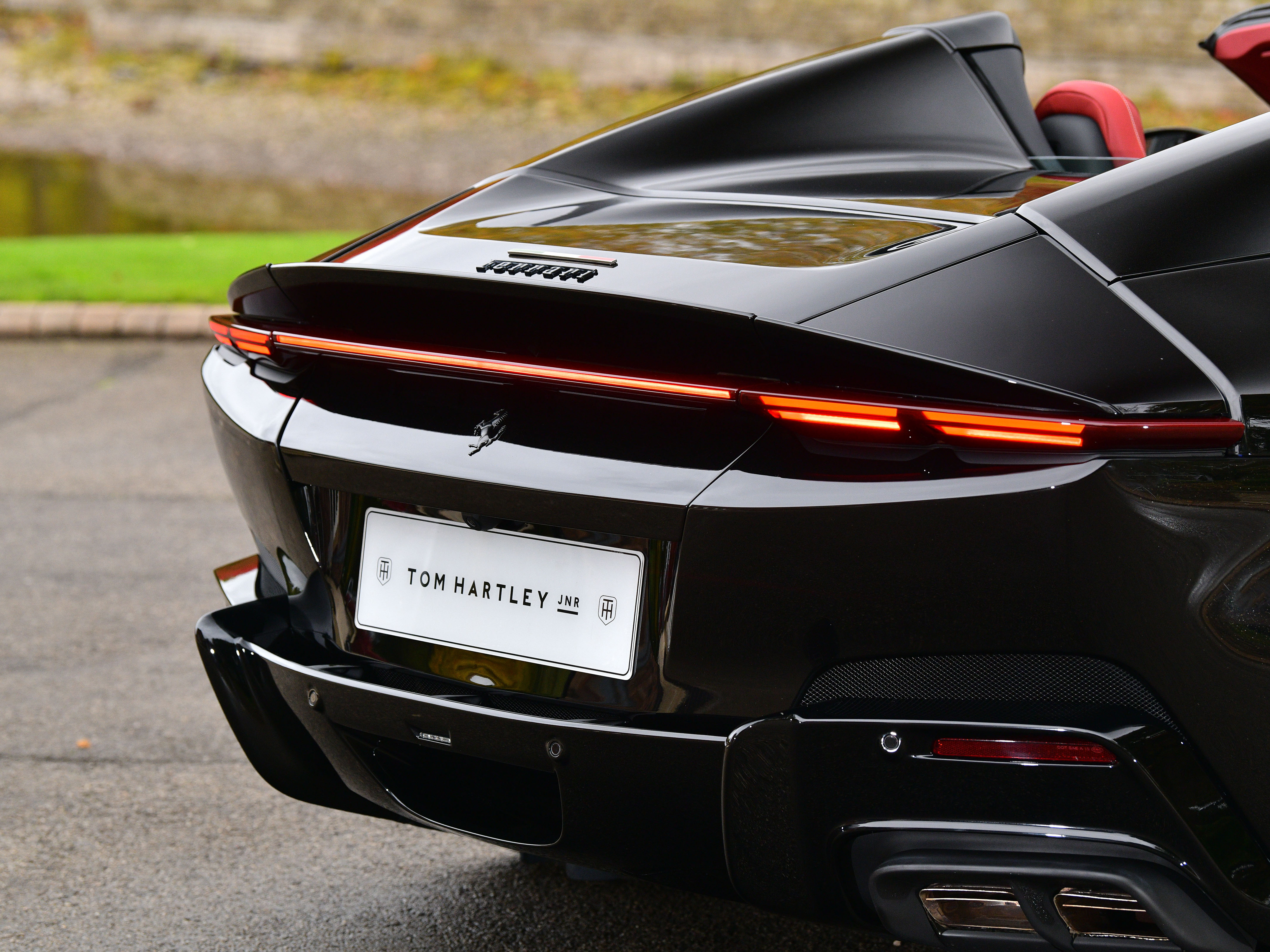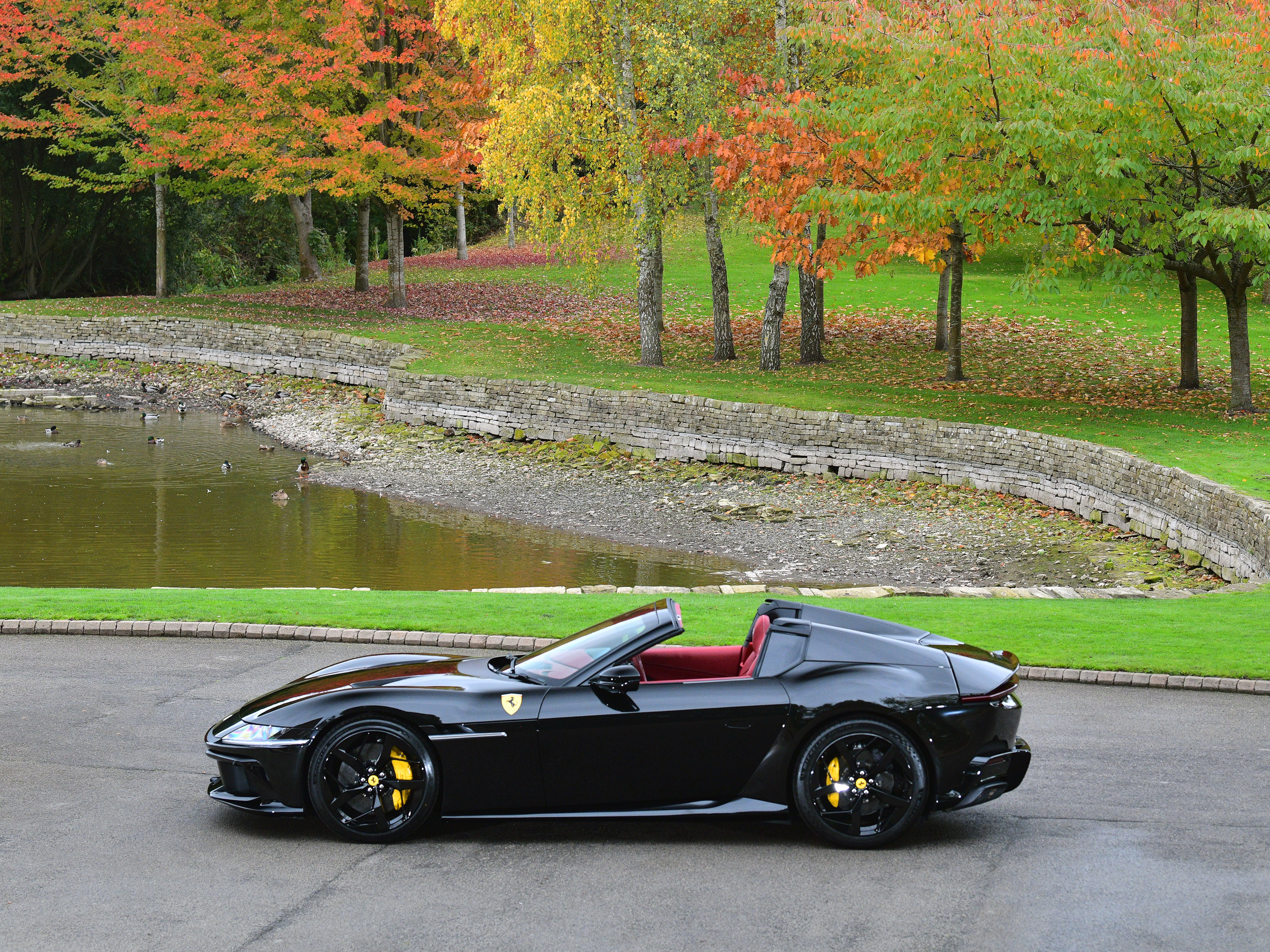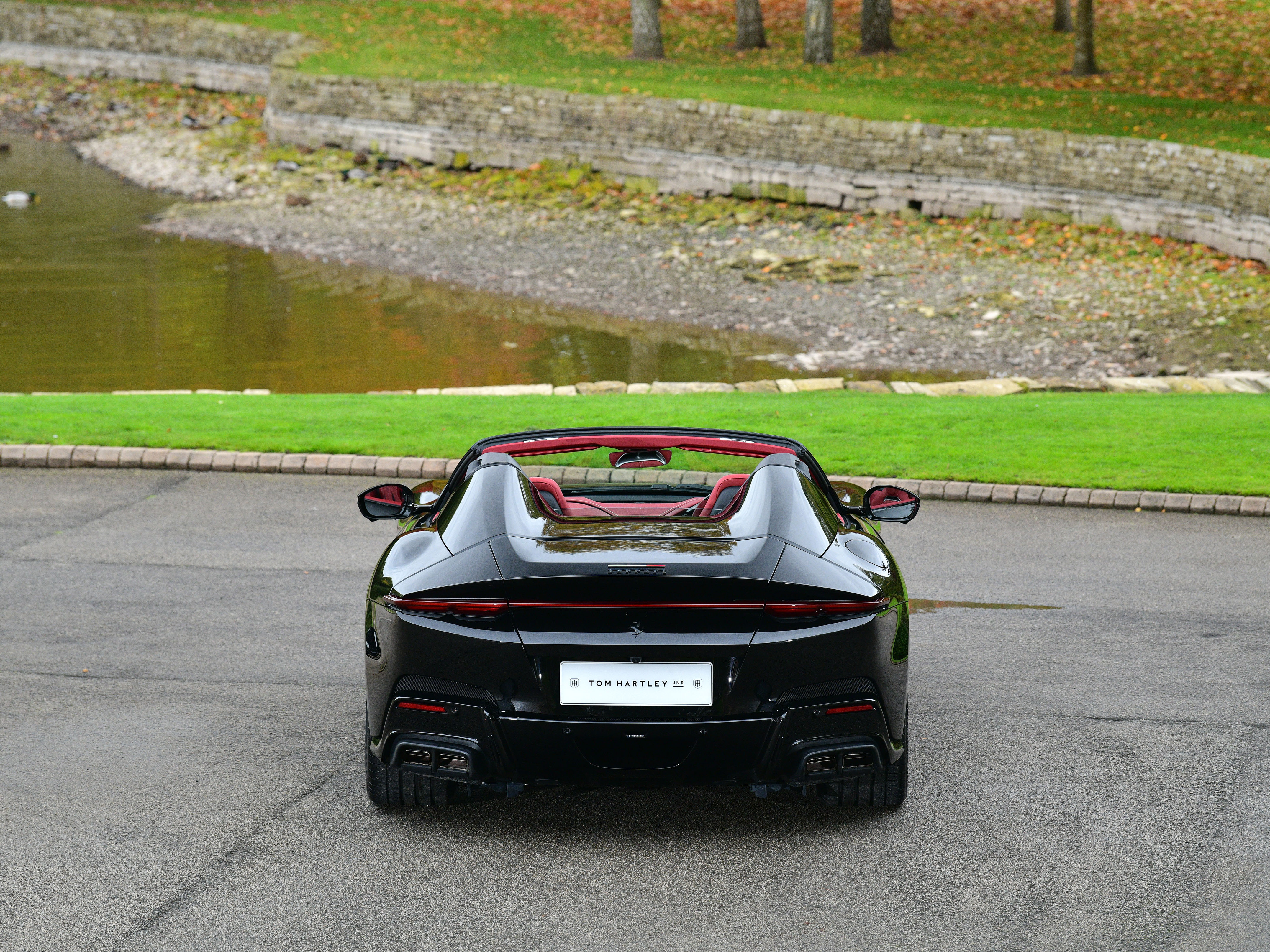 This delivery-mileage, UK-supplied example was commissioned to an outstanding specification, including: Extracampionario Nero Stellato (2-layer special paint), carbon fibre steering wheel with LED shift lights, carbon fibre exterior sill kicks, upper tunnel trim, instrument cluster and door panels, high-end audio system and passenger display, smartphone connection and wireless charger, leather racing seats in Bordeaux with massage, ventilation and neck-warmer functions, heated Bordeaux steering wheel with matching seat belts, embroidered Prancing Horse headrests in Chiaro Grigio, dual-colour leather interior with Bordeaux lower dashboard and Filo Speciale Grigio Chiaro stitching. Bordeaux mats with logo and aluminium footrests, suspension lifter, surround view, adaptive cruise control and radar safety systems, active Matrix LED headlights, Nero DS external painted pack and glossy painted Orbit rims in Nero DS, airbrushed Scuderia shields, long Italian flag and full badges in matt black, yellow brake calipers and black ceramic exhaust pipes and My Ferrari Connect; emergency call and tracker security system. In total, the cost new price was £494,160.01.